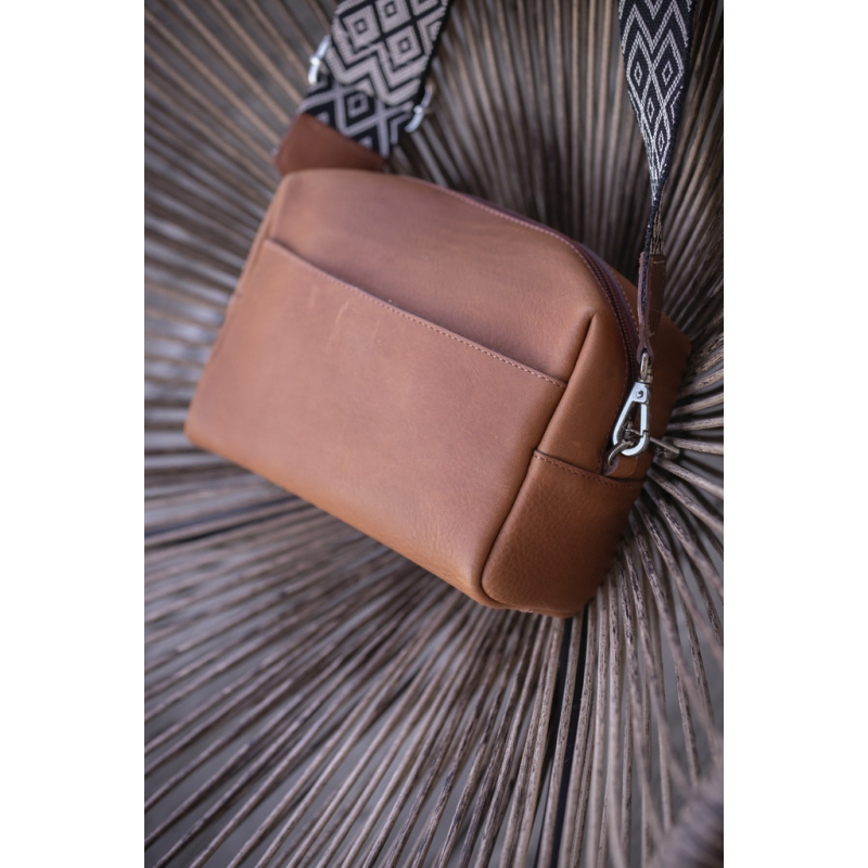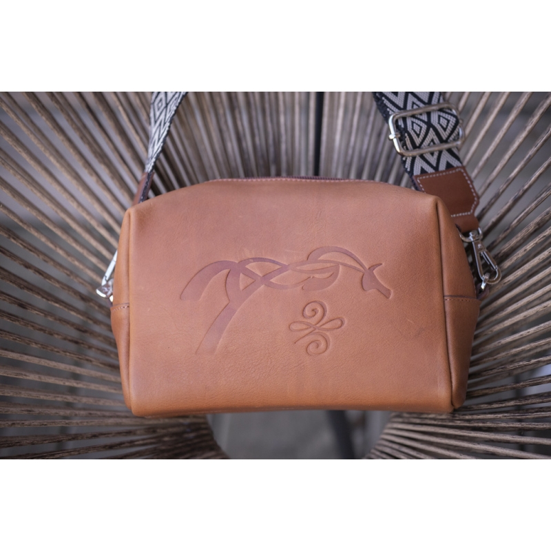 The 'Laly' small handbag, zippered on the top, is available in a choice of beautiful grained cognac leather or perforated black leather. It also features a wide chevron-patterned shoulder strap. On the outer front of the bag, you'll find both the Pénélope logo and the friendship logo embossed. This bag is perfect for carrying all the essentials a woman needs in her daily life.