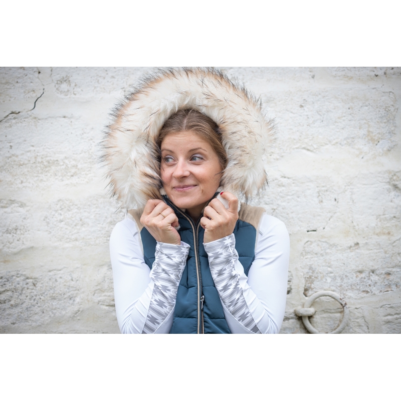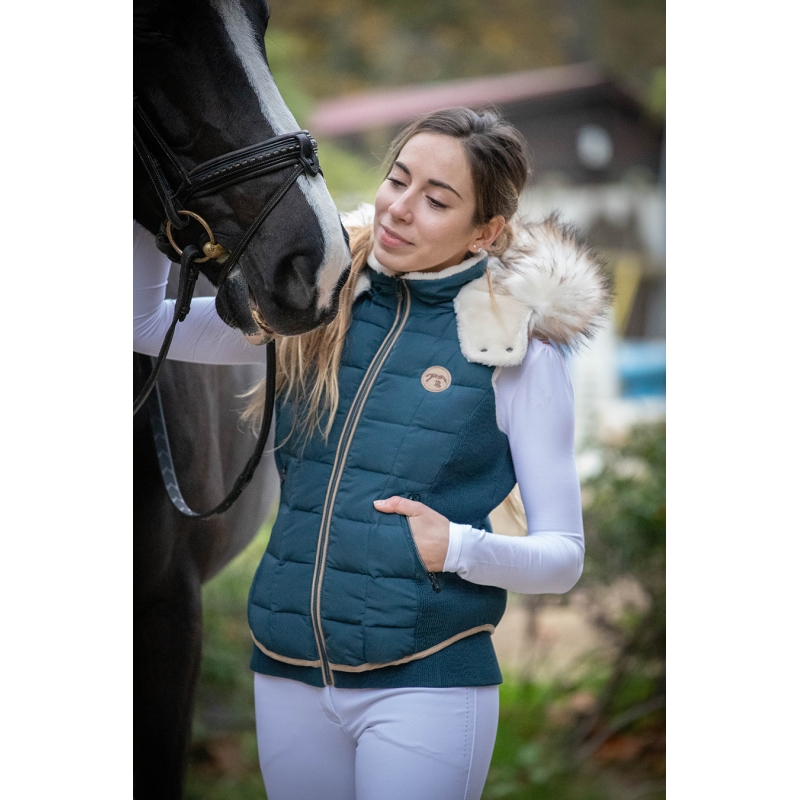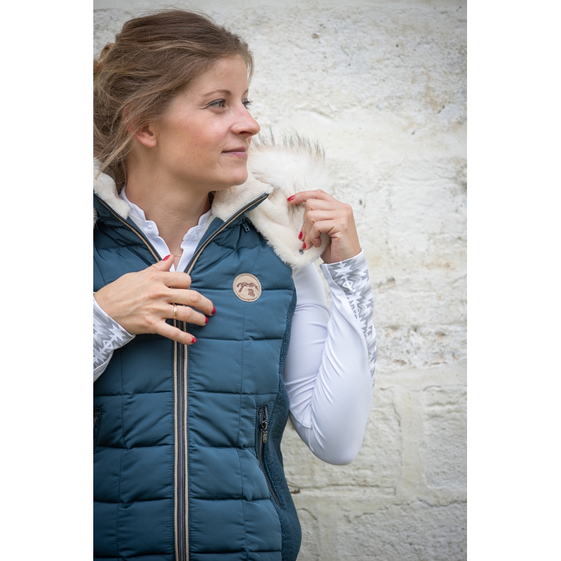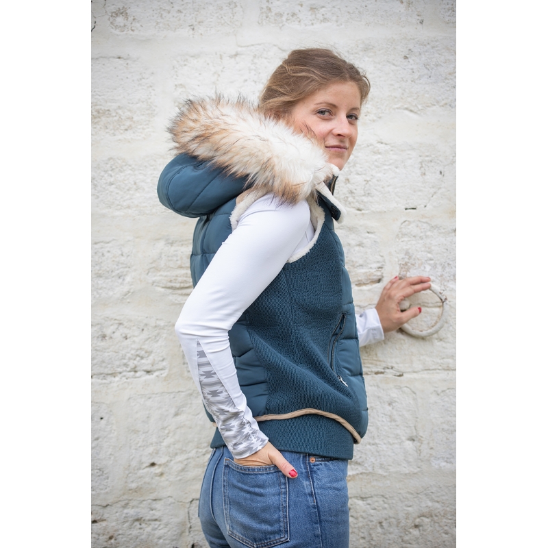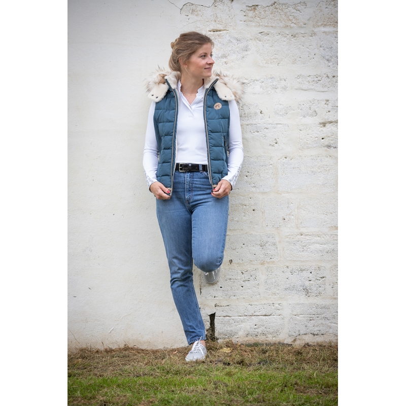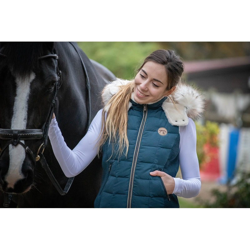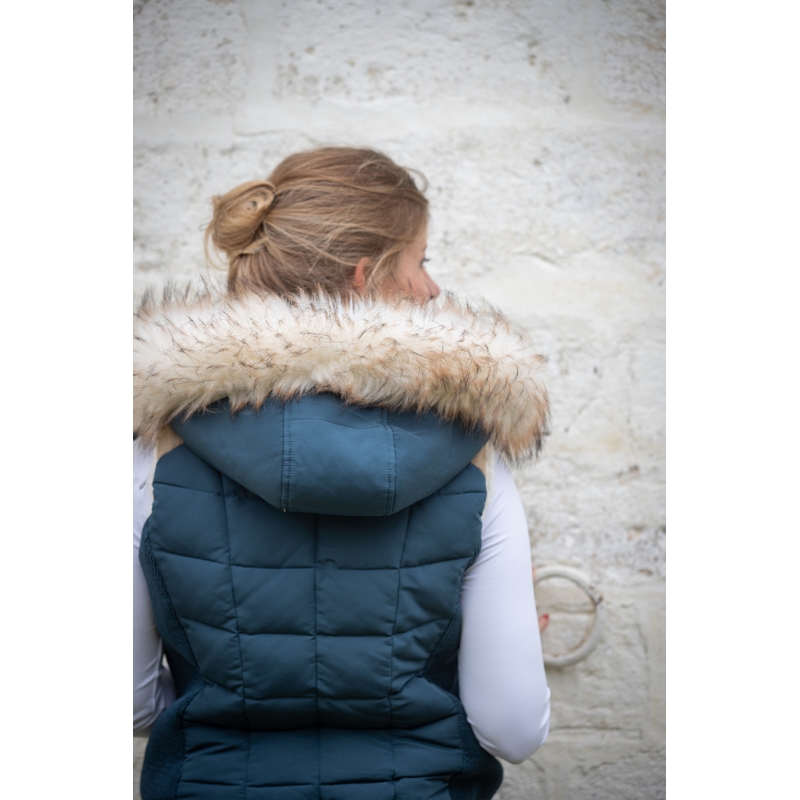 A well known product from Pénélope-store, coming now in Peacock blue colour for 2022 winter. Our sleeveless vest Roger is lined with an ultra-soft and warm fleece. It closes with a central zipper and has a hood with a beautiful fake fur. Stretch bands are sewn on the sides and bottom of the vest to provide a great comfort. On the heart, there is a patch in fake leather with the brand's logo. On the shoulders, there are inserts with the same fake leather fabric. Along the zipper and at the bottom, a braid in a similar fabric gives a nice finish. And, there are two zippered pockets in the front.