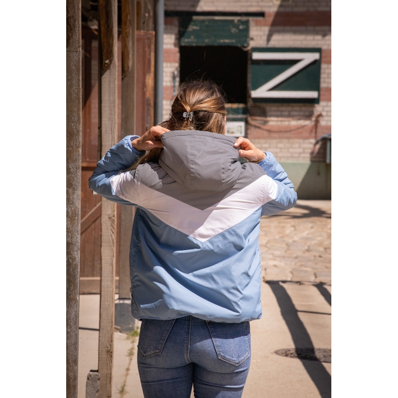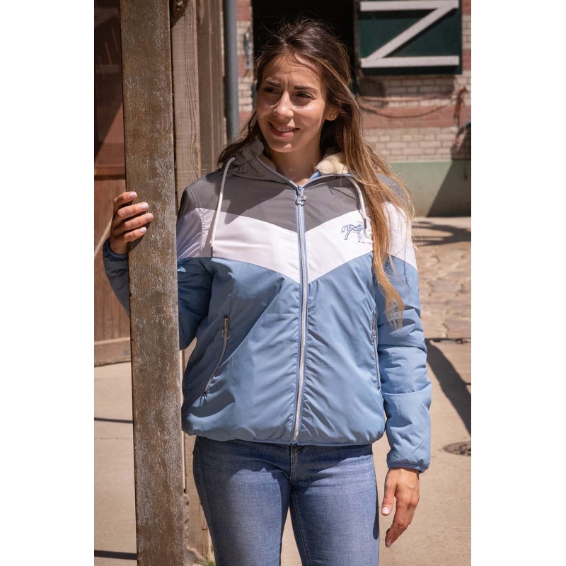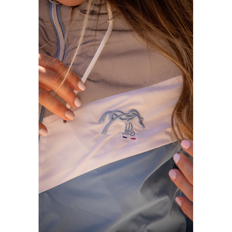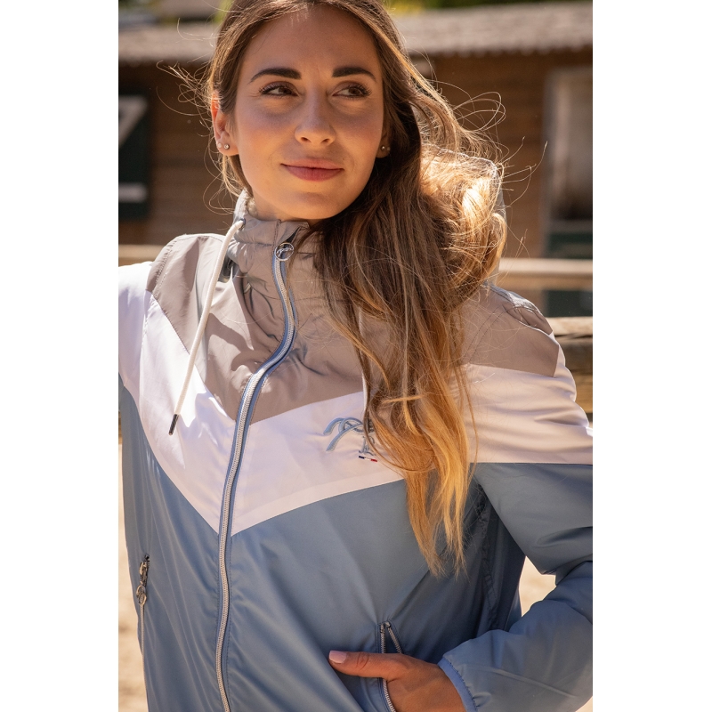 This jacket will not go unnoticed this season! Lecciblock is made of a super soft water repellant fabric and is lovely to wear. It is lined with a gorgeous off white fake polar fleece fur, comes with two pockets and a front zip. The hood is not removable and for the look, it is made of 3 colour blocks, taupe, white and light blue. It has an inside pocket and white tightening cords. Its bright colours and fitted cut will be perfect in the city or at the stables.