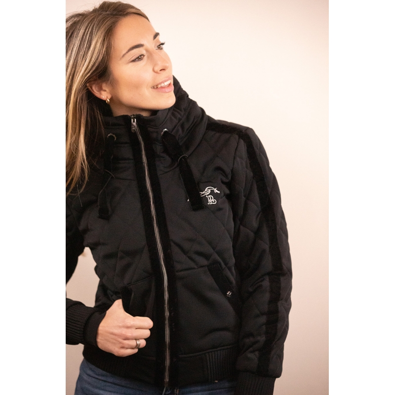 Pénélope Luka padded jacket with high neck. It is made of a "Soft touch" padded fabric. On the back, an elastic for optimum comfort, and a perfect fitting. It has a velvet strip on each arm, with the same piping on the tightening cords. To fasten it, there is a wide zipper on the front, and two pockets. Pénélope logo is embroidered on the chest.