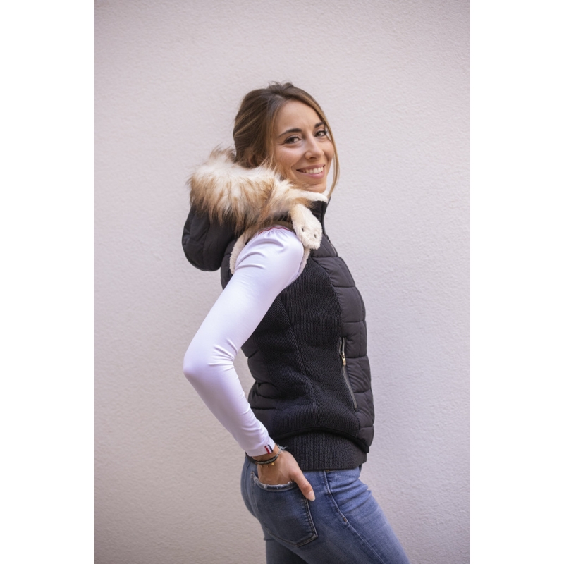 A thick, sleeveless padded jacket lined with a soft and plush fleece. It features a large front zipper and two zippered pockets. The slightly glittery fabric and removable hood lined with removable fake fur make the New Roge padded jacket a very girly product. Ribbed cuffs and bands on the sides and bottom add a touch of comfort and allow for a versatile fit for various body types. The added detail is a bronze patch on the heart area decorated with the Pénélope logo.