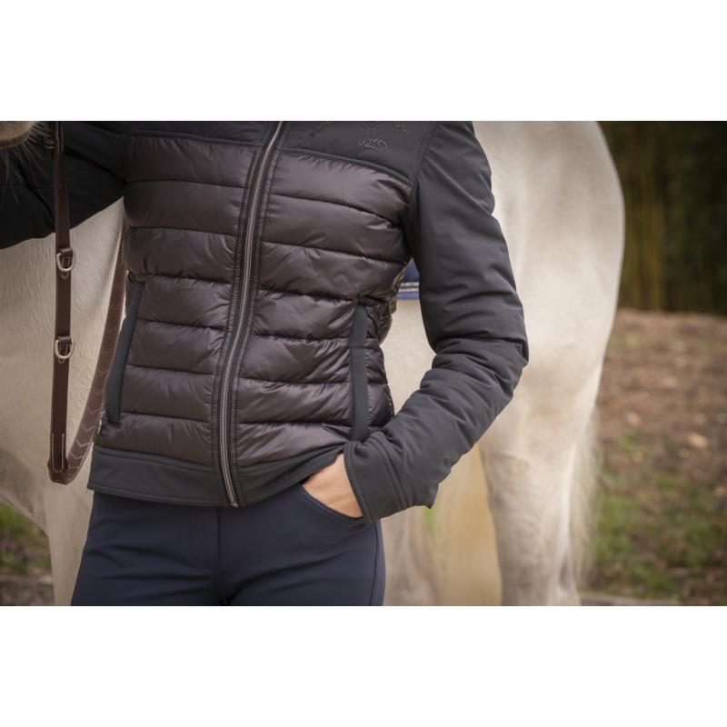 Edelweiss long-sleeved quilted jacket in two fabrics with a rhinestone logo on the heart. Its high collar, short waist, light quilting and ultra-feminine rhinestones make our Edelweiss jacket a must-have for autumn-winter 2023/2024. It fastens with a large front zip and has a zipped pocket on each side.