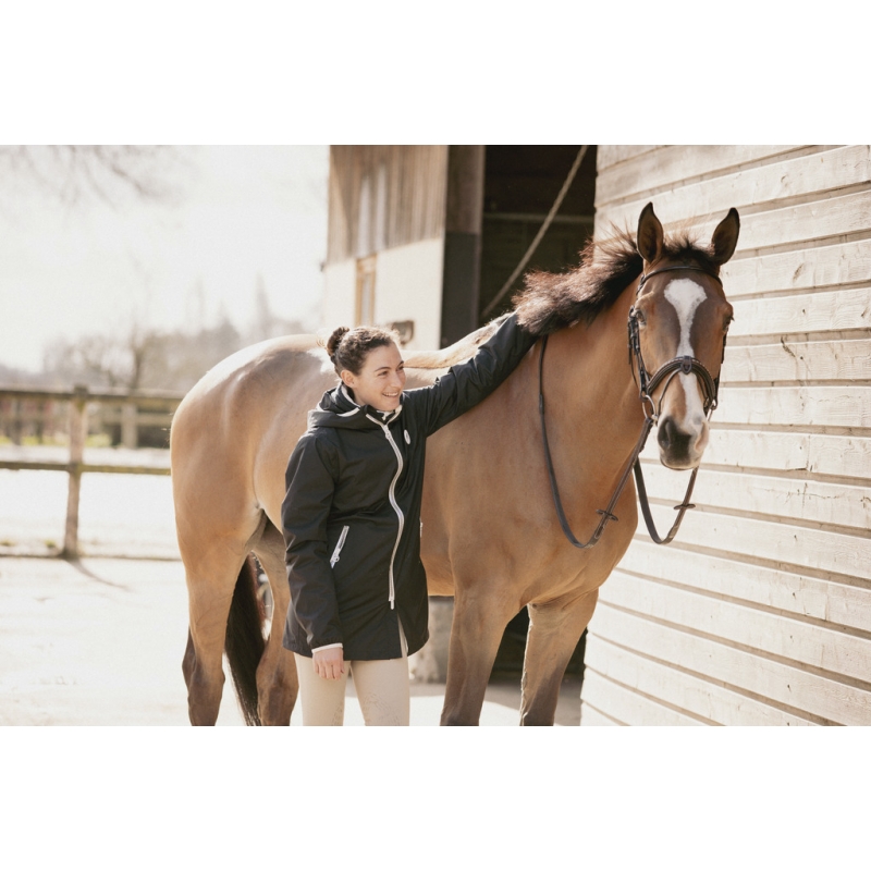 Easy to wear on horseback thanks to its two-way zipper and back slit. It also slips on easily in the city.