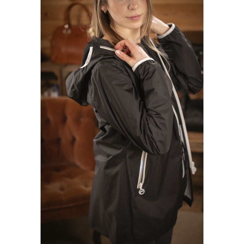 Mid-length waterproof 'Fashion Rain' jacket with front zip, hood, and taped seams. It is entirely black with white cuffs and hood trim. The main zipper and those of the two pockets are also white. On the chest, there is a round Pénélope logo in silicone (white background and gray logo). Unlined and very lightweight to wear, a Pénélope logo border is visible on the inside of the garment.