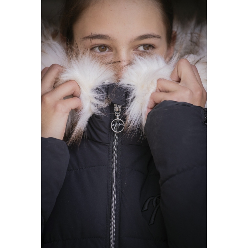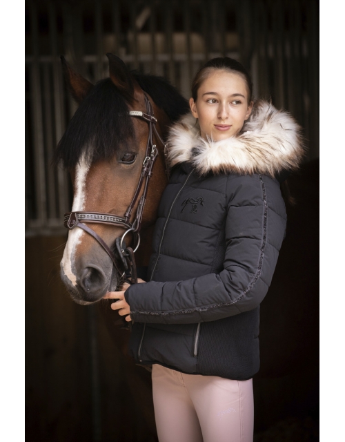 The Louxy Jacket is a puffer-style jacket with thick, horizontal quilting, made from a very comfortable stretch fabric. On each side, stretch ribbed panels enhance the comfort of this winter garment. Inside, a beautiful ultra-soft fleece provides excellent warmth for the winter season at the stables. In terms of style, a glossy and glittery trim runs down the length of the arms. The Pénélope logo is embroidered in a raised, tone-on-tone design on the chest. The removable hood is adorned with a stunning faux fur trim. It fastens with a large central zipper and has two zippered pockets on the sides, as well as an additional interior pocket on the left side.