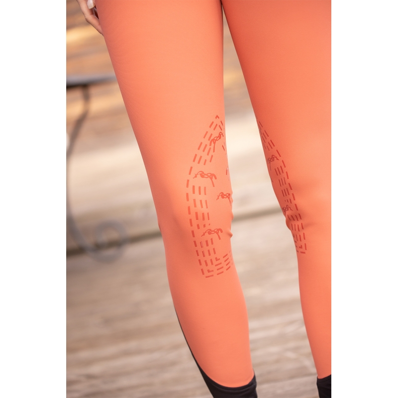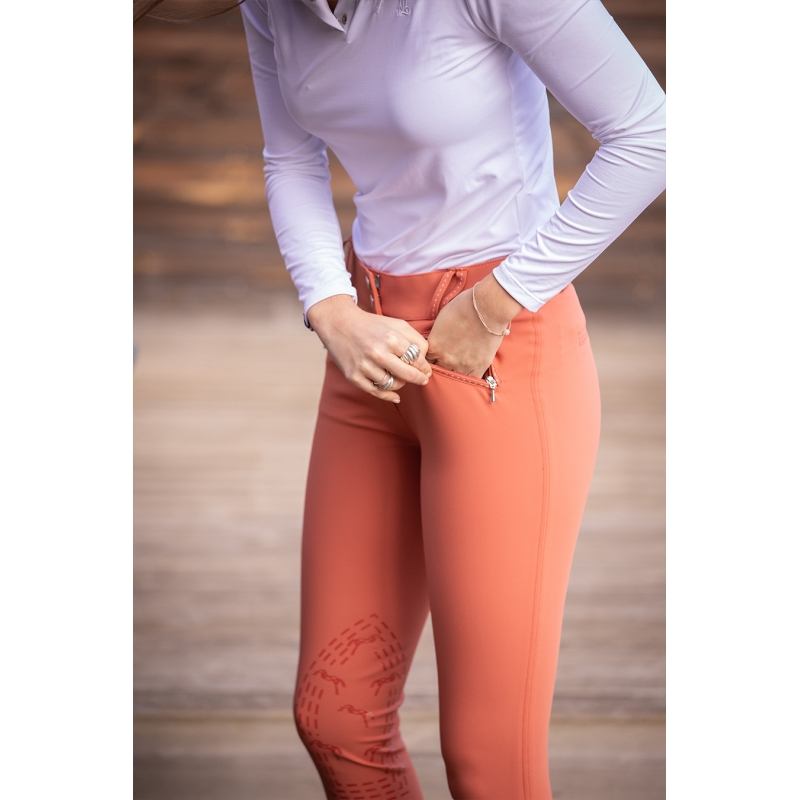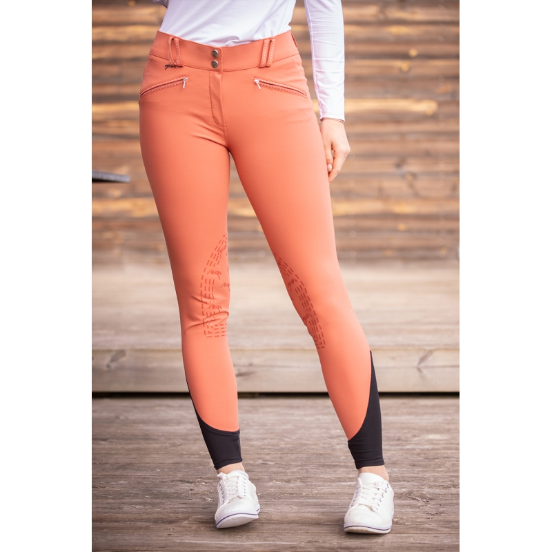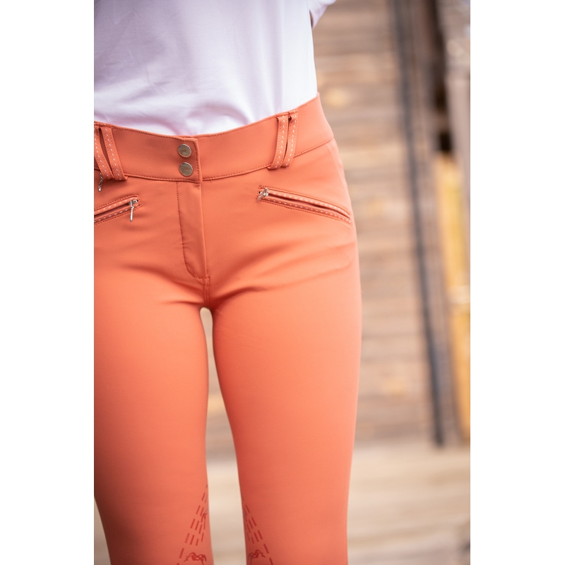 Rocky Pénélope breeches. Comfortable and technical breeches for horse riding show days. Their close-fitting cut and mid-rise waist create a perfect silhouette. They have two small zippered pockets at the front and two fake pockets at the back. Equipped with a fairly wide belt for good waist support, they fasten with two small tabs at the front and have relatively slim belt loops. Inside the knees, there is a grip area to secure the leg when in the saddle. The leg bottoms are made of lycra to accommodate various body shapes and leg sizes.