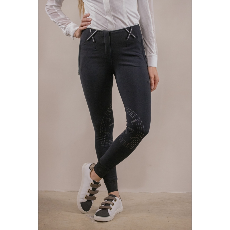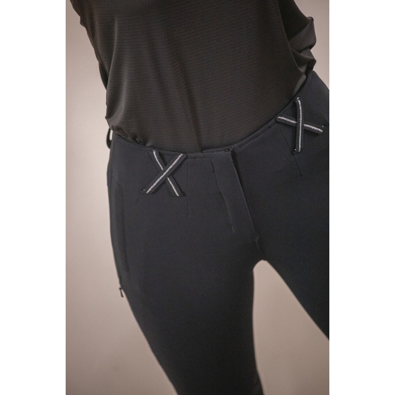 With its wide belt featuring crisscross loops and no buttonhole, the 'Zuri' Breeches close with a discreet small hook atop a front zipper. They also have two discreetly stitched front pockets, closed with a zipper. Even more discreet, a small phone pocket, closed with a slim zipper, stands out on the right leg. Inside the knees, Pénélope branded silicone grips enhance leg stability. The leg bottoms are made of lycra for added comfort and accommodate various sizes and body shapes. Very comfortable, it has this 100% Pénélope original look that stands out for the 2024 season!