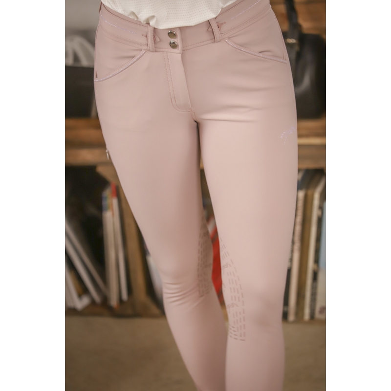 The powder pink Élégance Breeches feature a row of rhinestones on the waistband and along the front and back pockets. A little Penelope horse, also in rhinestones, sits in the middle of the left thigh. Inconspicuously, a small phone pocket with a slim zipper is located on the right leg. These comfortable stretch breeches have non-slip reinforcements on the inside of the knees and a slightly high, close-fitting waist. The lower leg is made from Lycra to adapt to a wide range of body shapes. A very pretty, feminine piece that is comfortable to wear and sure to cause a sensation at the stables.