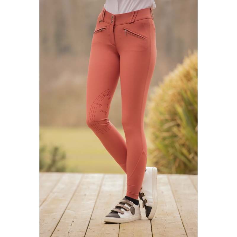 Comfortable and technical, the Pénélope Rocky breeches are perfect for everyday wear at the stables. Their close-fitting cut and mid-rise waist enhance the silhouette beautifully. The breeches feature two small zipped pockets at the front and two faux pockets at the back. They have a fairly wide waistband for excellent support and fasten with two small tabs at the front. The belt loops are slim and discreet. Inside the knees, a grip zone ensures a secure leg position in the saddle. The lower legs are made of Lycra, allowing for a perfect fit on all body shapes and leg lengths.
