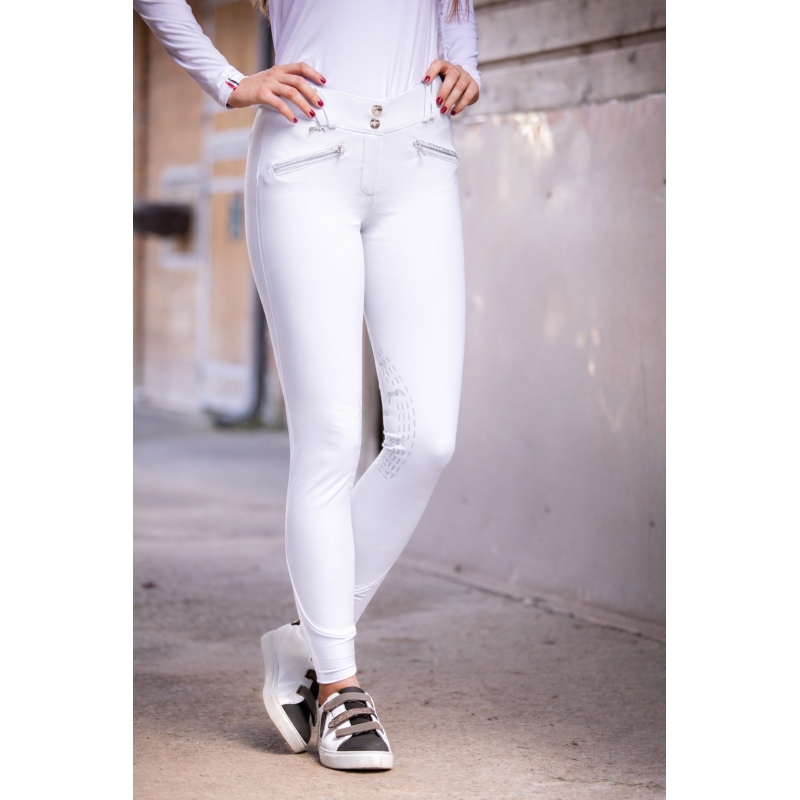 Rocky Stone Breeches is a comfortable and technical breeches for everyday use. Its close-fitting cut and mid-rise waist perfectly outline the silhouette. It features two small zippered pockets on the front and two faux pockets at the back, enhanced with a discreet row of rhinestones. The breeches have a fairly wide waistband for good support at the waist. They close with two small tabs at the front and have slim belt loops. Inside the knees, there is a grip area to secure the leg once in the saddle. The leg bottoms are made of lycra to adapt to all body shapes and leg lengths.