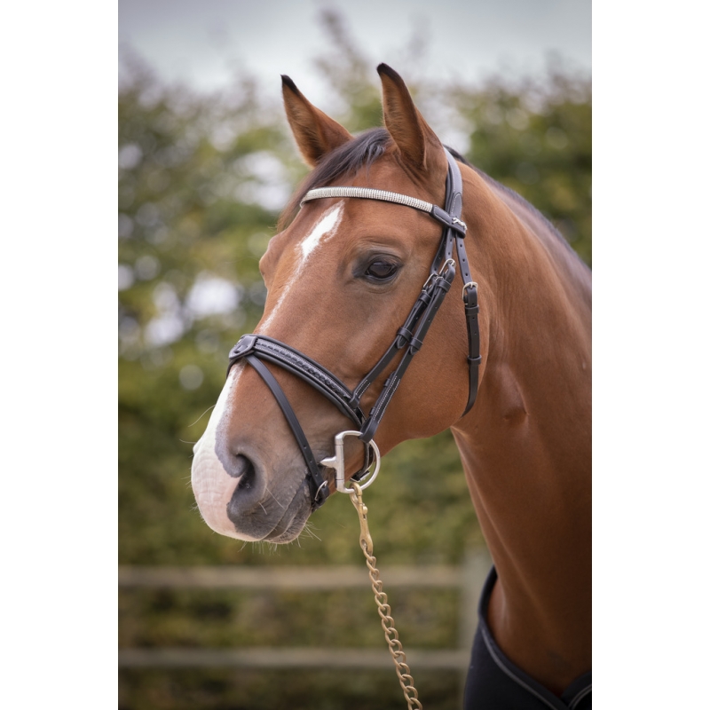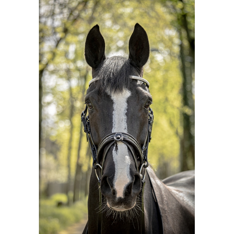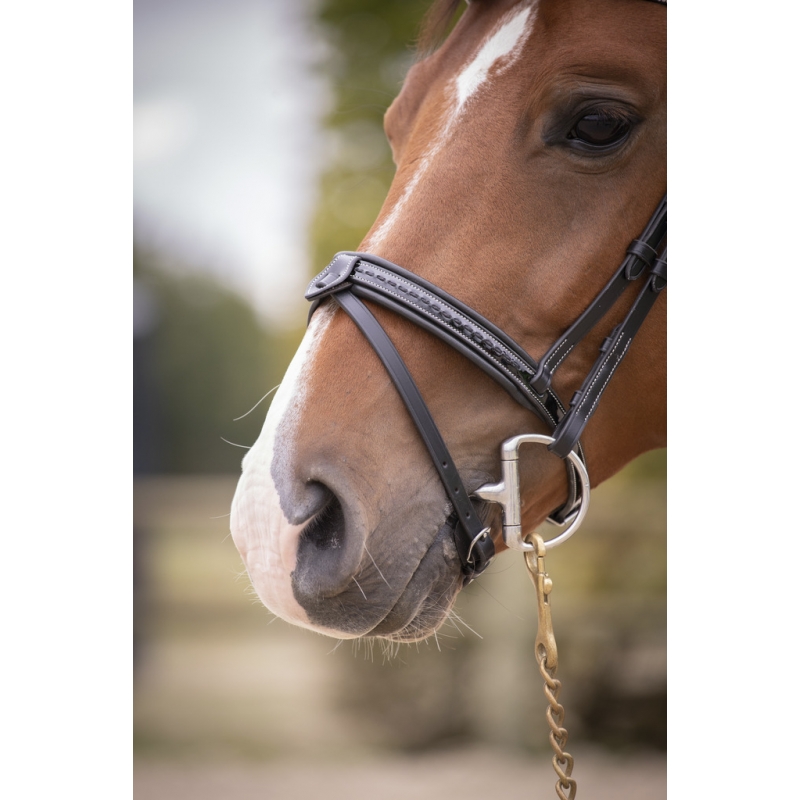 Pénélope leather bridle with contrasting cream stitching on the headpiece and noseband and soft leather lining. It has an attractive curved leather browband with rhinestones on the top. The Pénélope logo is on the left end in the form of a pin. The noseband is wide, with a noseband attachment and decorated with a delicate patent saddle stitch. The headpiece is wide so that there can be a better spread of the pressure on the horse's neck. The Harmonie bridle is sold with a pair of reins. It can be used in horse shows as well as in training at the stables, you pick!