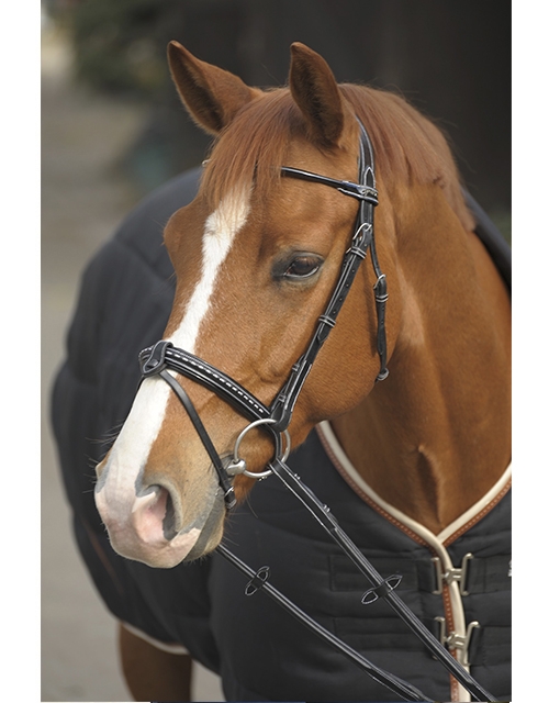 Beautiful bridle in very supple leather. Equipped with a noseband combined with a saddle stitch. The browband is round and patent. A wide headpiece to improve comfort and pressure distribution on the horse's neck. The bridle comes with a pair of leather and rubber reins with non-slip spikes.