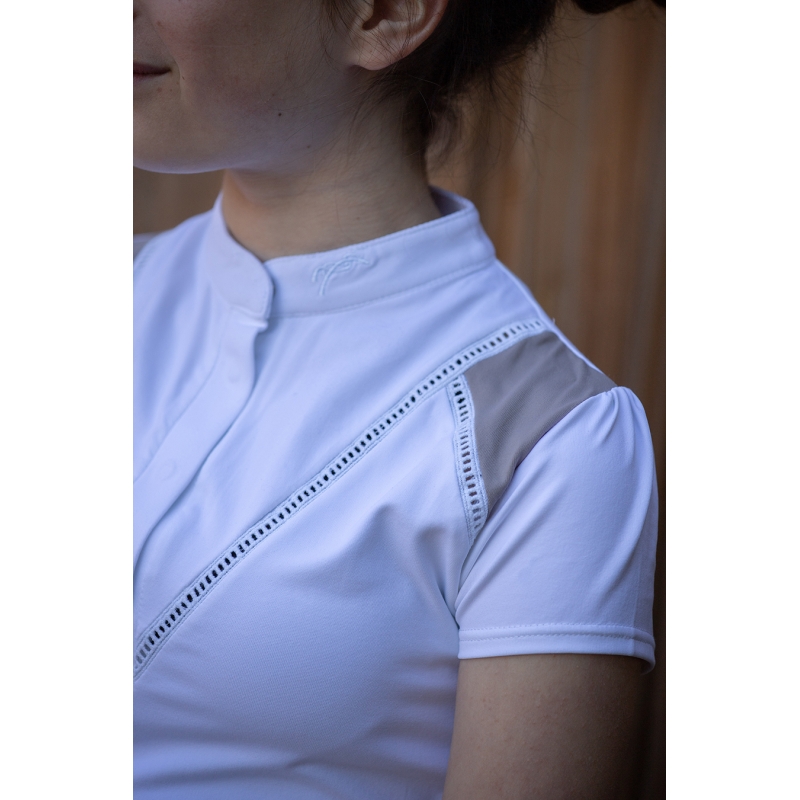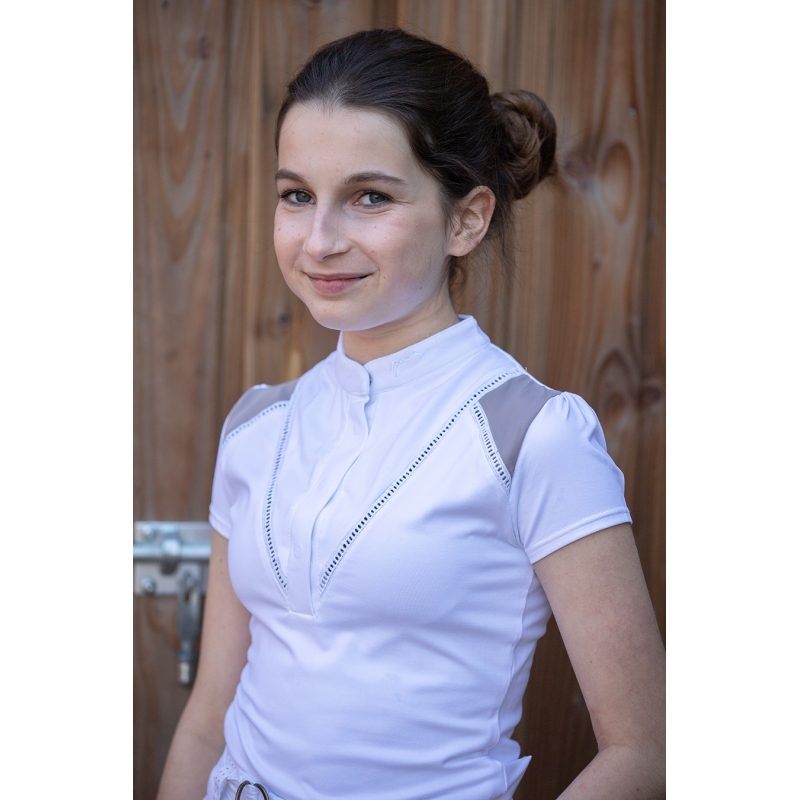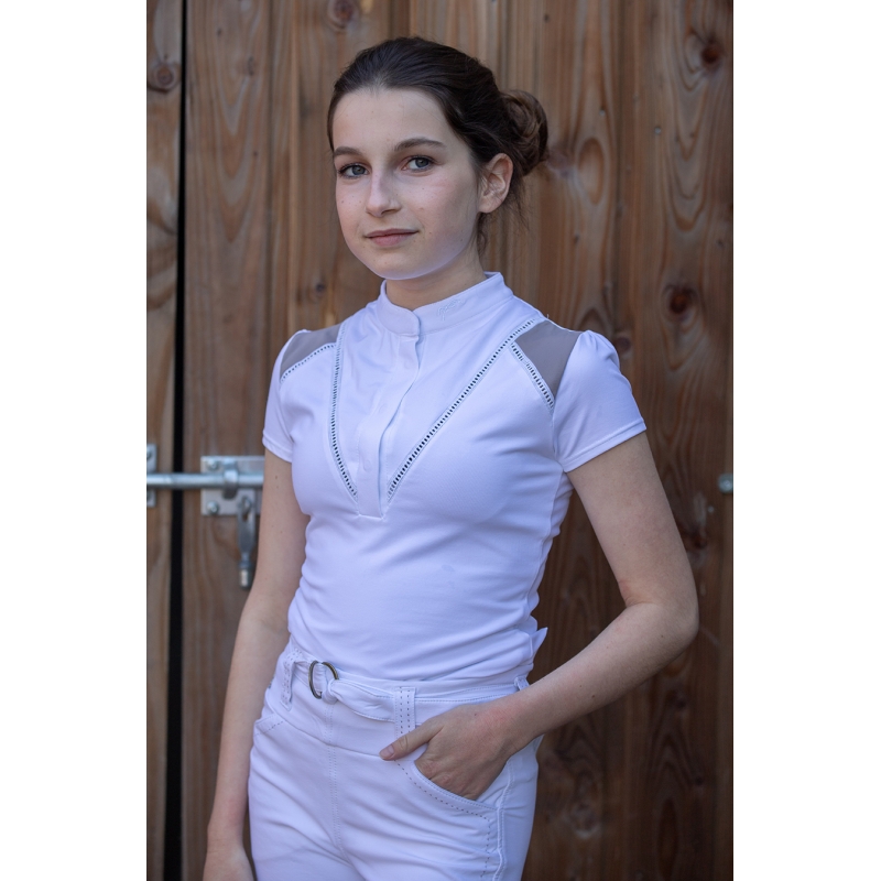 A wild new competition polo shirt is coming at Pénélope : Junior Venise polo shirt. Completely stretch for a nice wear, liberating each and every movement of our youngest riders, it comes with short sleeves slightly pleated, a short stand up collar fastened thanks to a hidden snap button, and the neck part is also fastened thanks to a hidden buttonhole. On the shoulders, two taupe parts, contrasting, defined by a jour Venise (lace) making Venise very feminine. It is ideal for every rider riding in competitions, to wear under the jacket or on its own according to the jury.