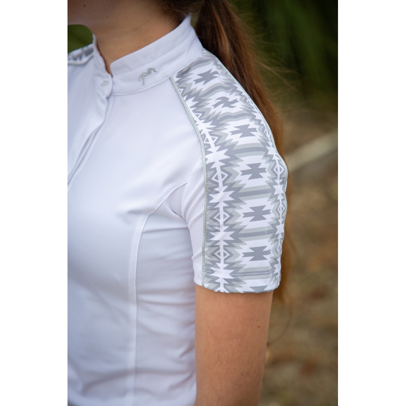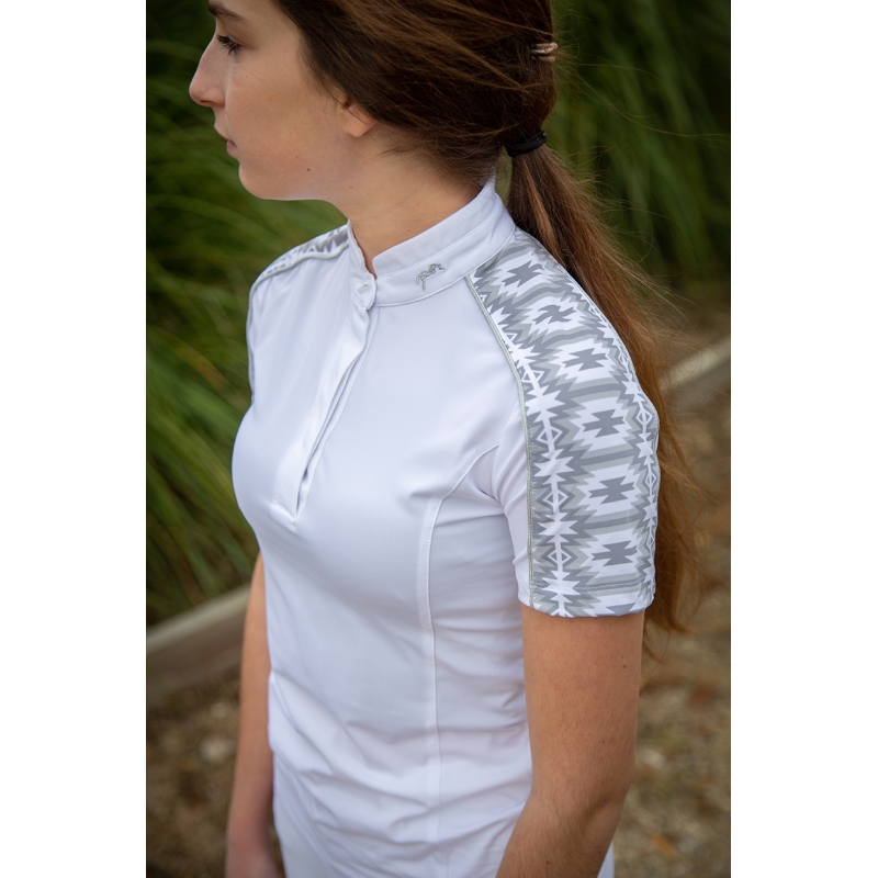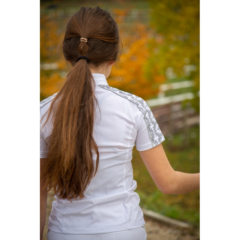 Super comfy, our competition polo shirt Anaïs is easy to spot with those gorgeous white and grey inserts on the shoulders. It has a white officer collar for competitions. Its stretch fabric offers a great comfort and a complete freedom of movement. It closes with buttons on the front. It can be combined with white breeches for competitions.