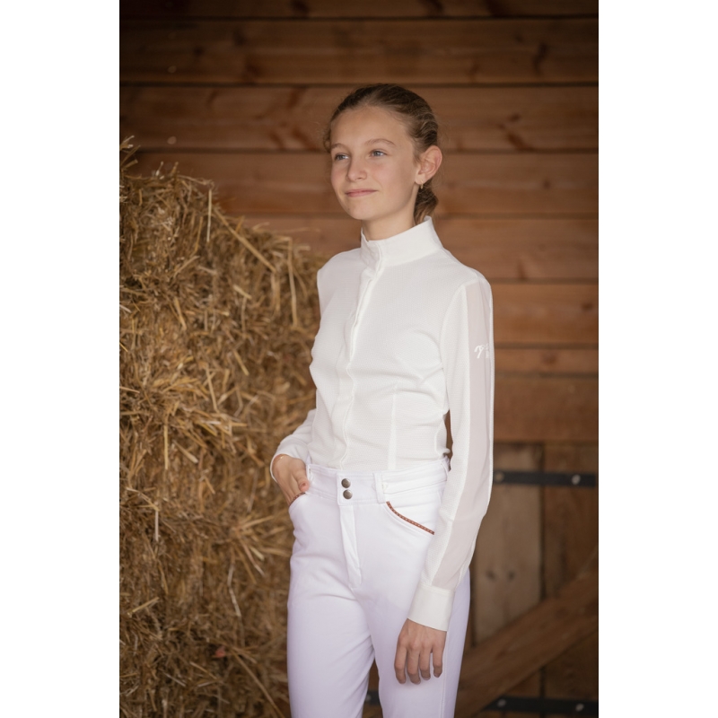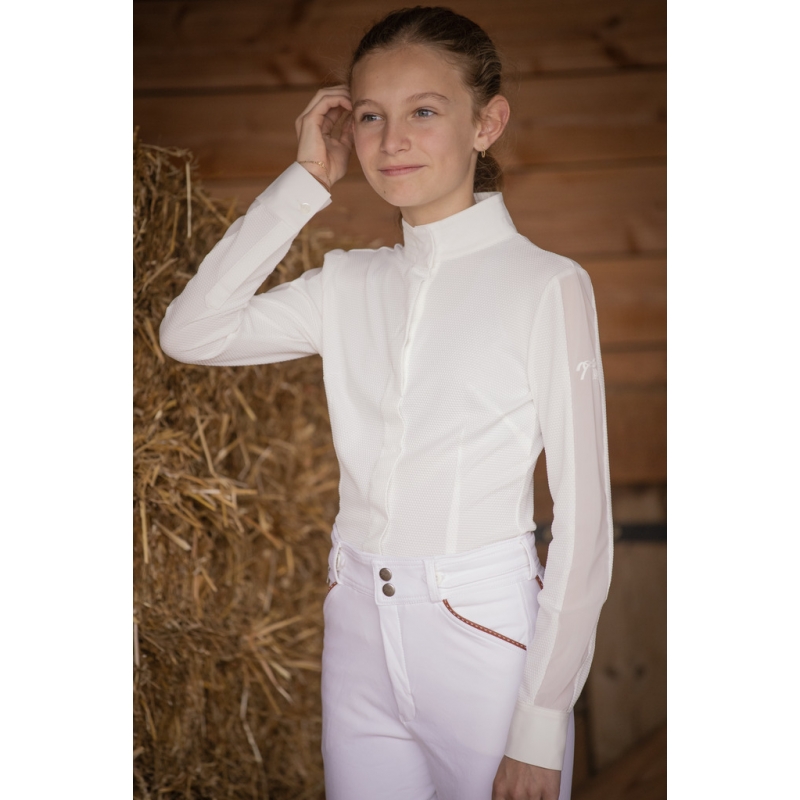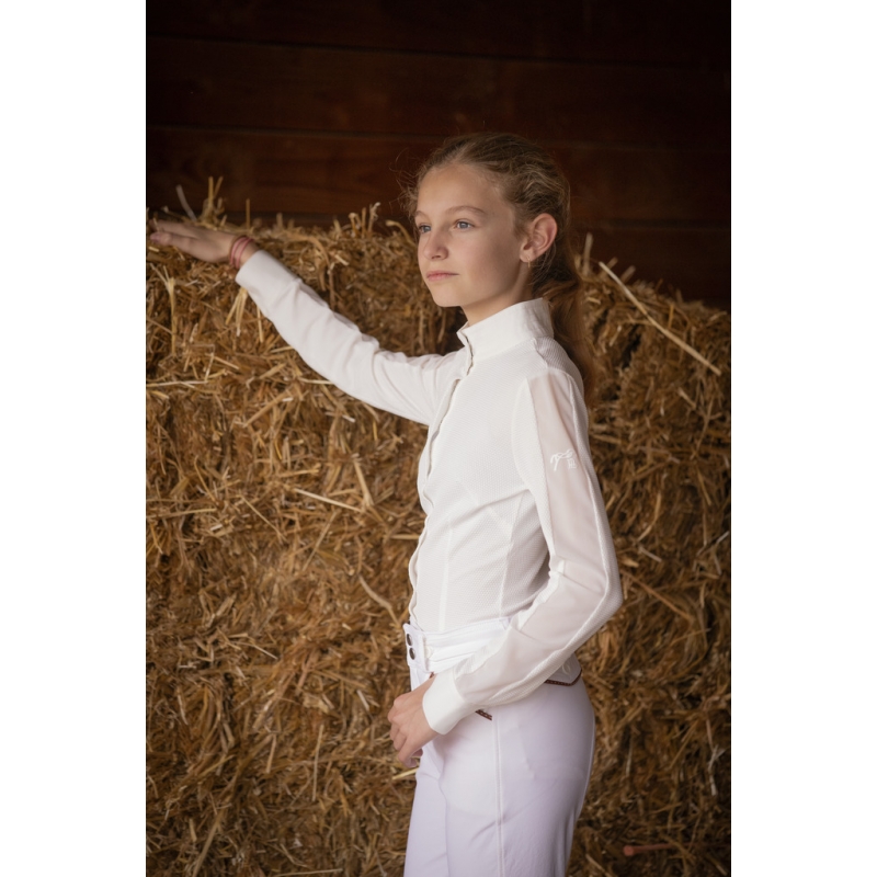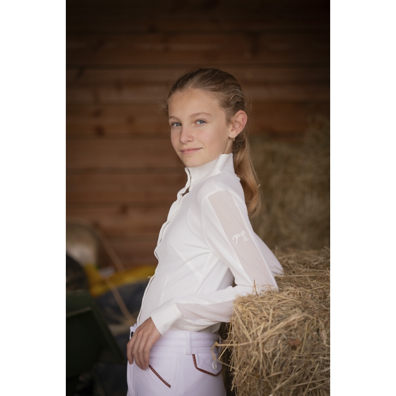 Las Honey Show Polo Shirt made from white honeycomb fabric, lightweight and breathable. It features a stand-up collar enhanced with delicate tone-on-tone stitching and a tone-on-tone plastron that closes with a row of buttons hidden by a flap. For a feminine and glamorous touch, a transparent voile fabric runs along the length of the sleeves. On the left long sleeve, the Pénélope logo appears in a rubber-like material. Chic and technical, it is easily worn in equestrian shows for a sleek and efficient look.