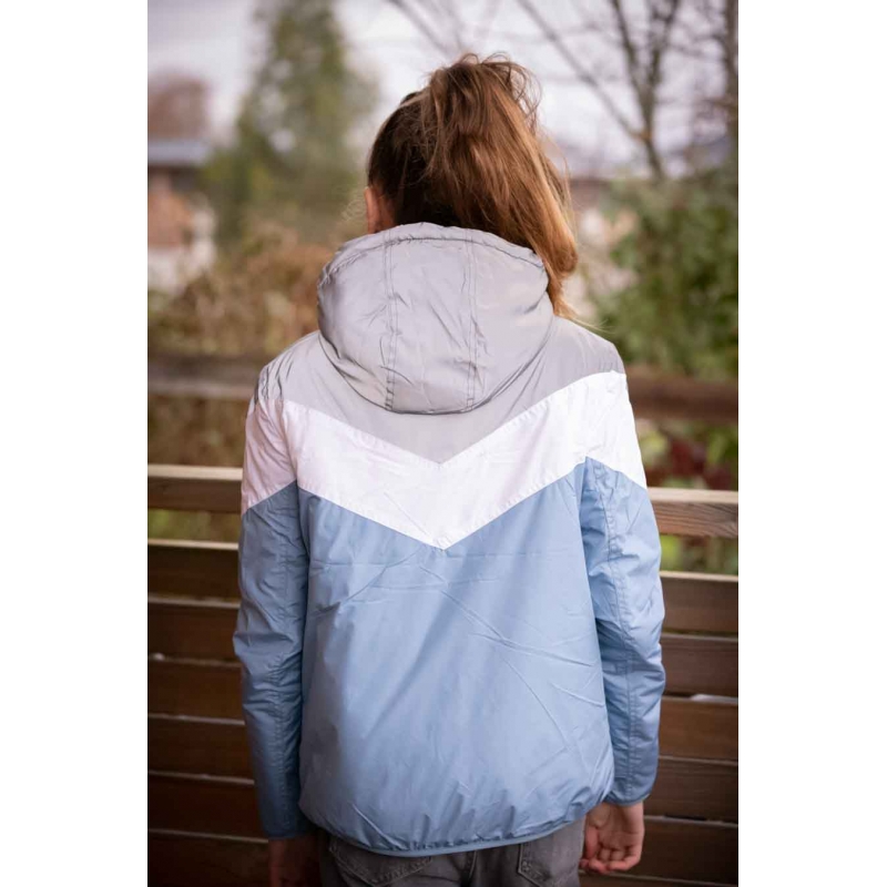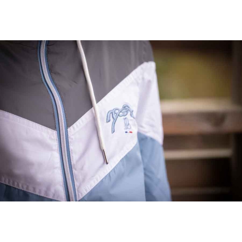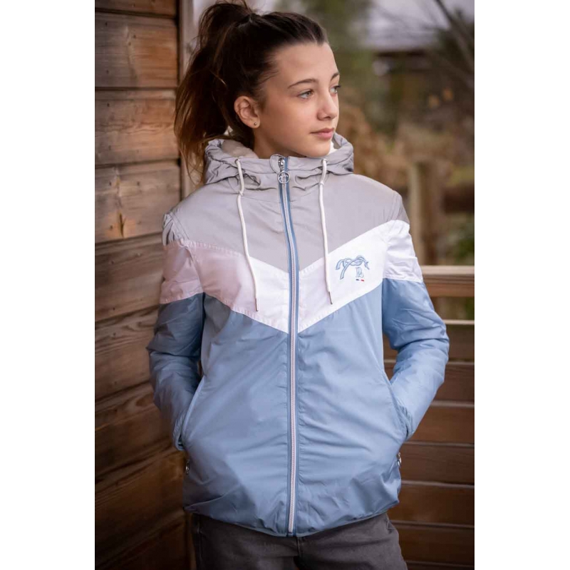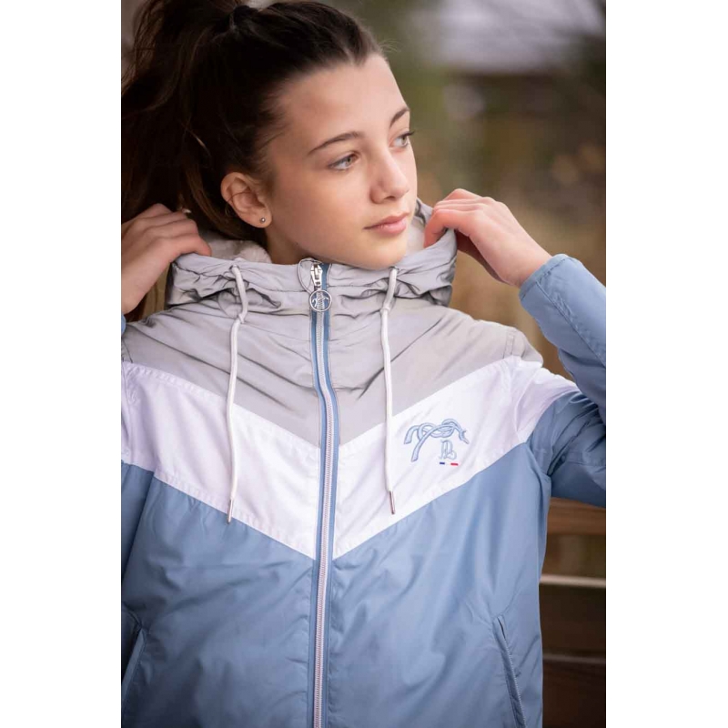 You won't be able to not see this jacket! Lecciblock is made of a super soft water repellant fabric and is lovely to wear. It is lined with a gorgeous off white faux fur, comes with two pockets, and a front zip. The hood is not removable, and for the look, it is made of 3 colour blocks, taupe, white and light blue. It has an inside pocket, and white tightening cords. Thos bright colours and fitted cut will be perfect in the city, or at the stables.
