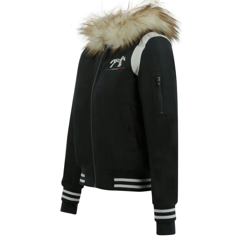 This little Lyon bomber jacket, iconic piece of Pénélope collections, combines fashion and comfort with a short cut on the waist. It has a zipper on the front and a non-removable hood with a real fake fur. Two snapped pockets are placed on each side. It has a zippered pocket on the left arm. On this new version, two off-white stripes have been added to the shoulders and stripes have been added around the elasticated waistband and cuffs.