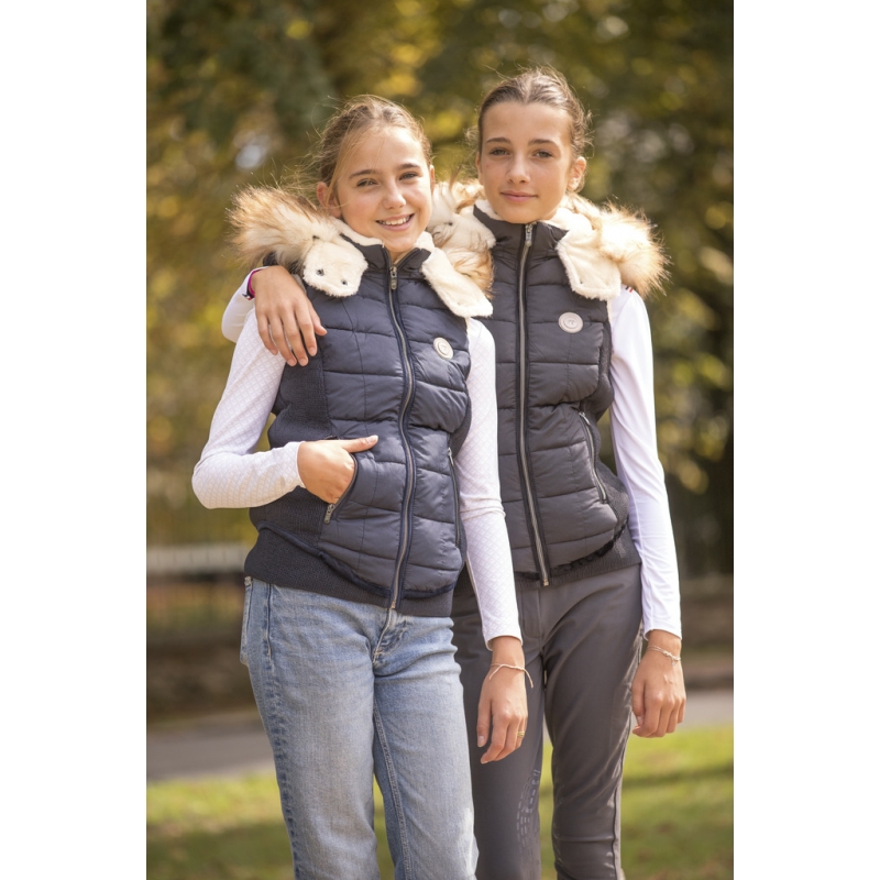 A thick, sleeveless padded jacket lined with a soft and plush fleece. It features a large front zipper and two zippered pockets. The slightly glittery fabric and removable hood lined with removable fake fur make the New Roge padded jacket a very girly product. Ribbed cuffs and bands on the sides and bottom add a touch of comfort and allow for a versatile fit for various body types. The added detail is a bronze patch on the heart area decorated with the Pénélope logo.