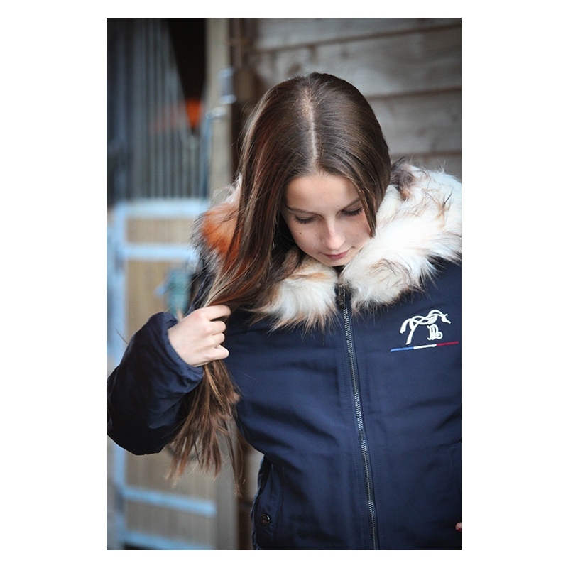 The brand's iconic bomber is available for the youngest. This short jacket like bombers jackets is lined with ultra soft fleece and has elastic band on the bottom of the jacket and cuffs. It has a central zipper and two buttoned pockets on the front. The hood is integrated and surrounded by a thick fake fur. This jacket is water repellent but not waterproof.