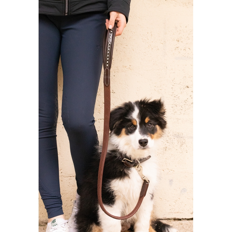 The Pénélope "Rubber" dog leash has a soft leather lined handle with a patent finish and a contrasting cream saddle stitch. It also has a soft rubber part with spikes that resembles the look of bridle reins.