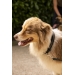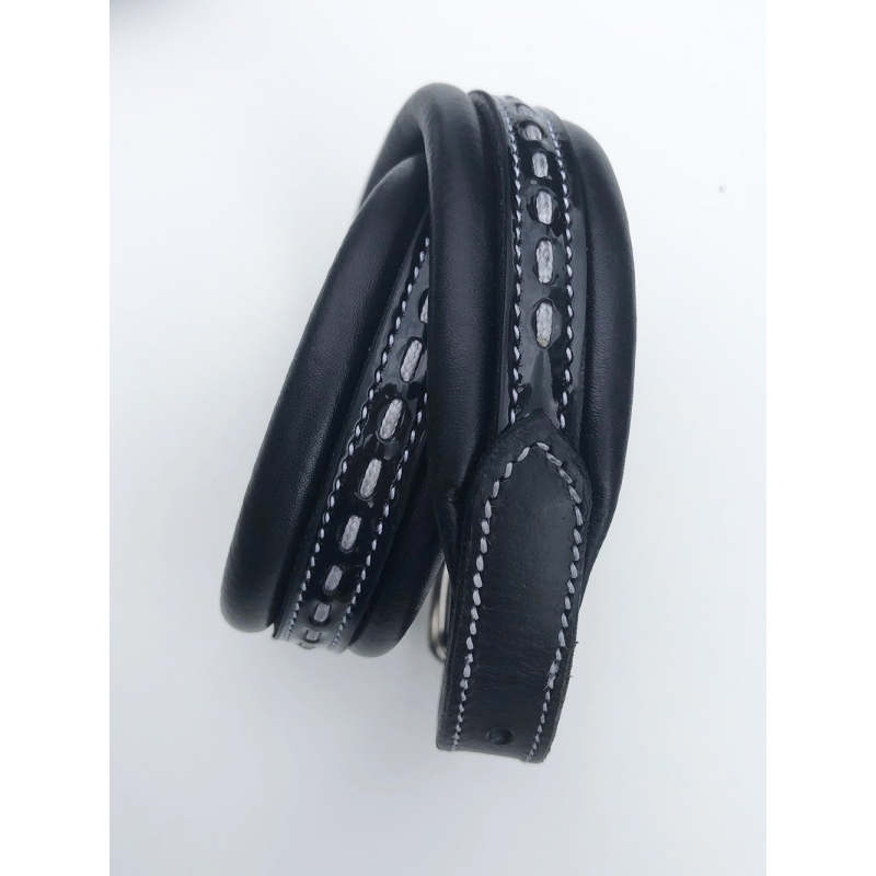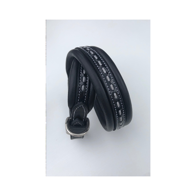 The dog collar is decorated with saddle stitch, and is fully lined for added comfort. It is equipped with a ring for the leash.