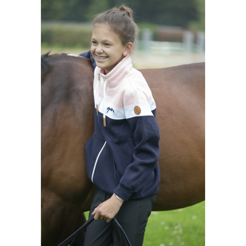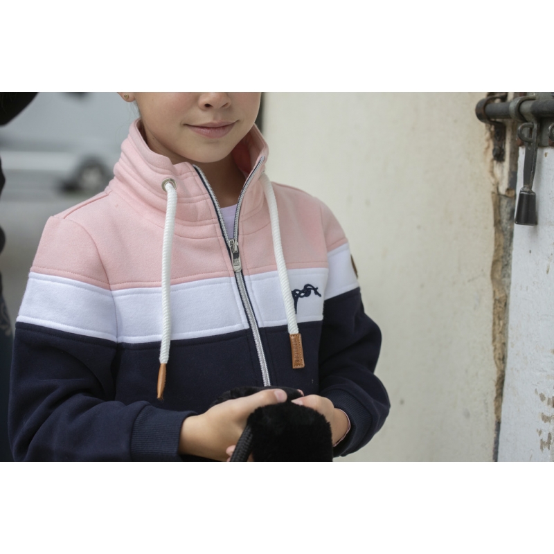 It has three large colored stripes in navy, white and pink. It closes with a large zipper. The two pockets on the front are open and decorated with a white saddle stitch in contrast. Two decorative nylon cords except for size 6 are sewn to the comfortable and warm stand-up collar. They are composed of fake leather cords at the ends where the name of the brand is embossed. On the heart, there is the embroidery of the Penelope logo. On the white band of the left sleeve, a round patch in fake leather is embroidered with the PL monogram on it.
