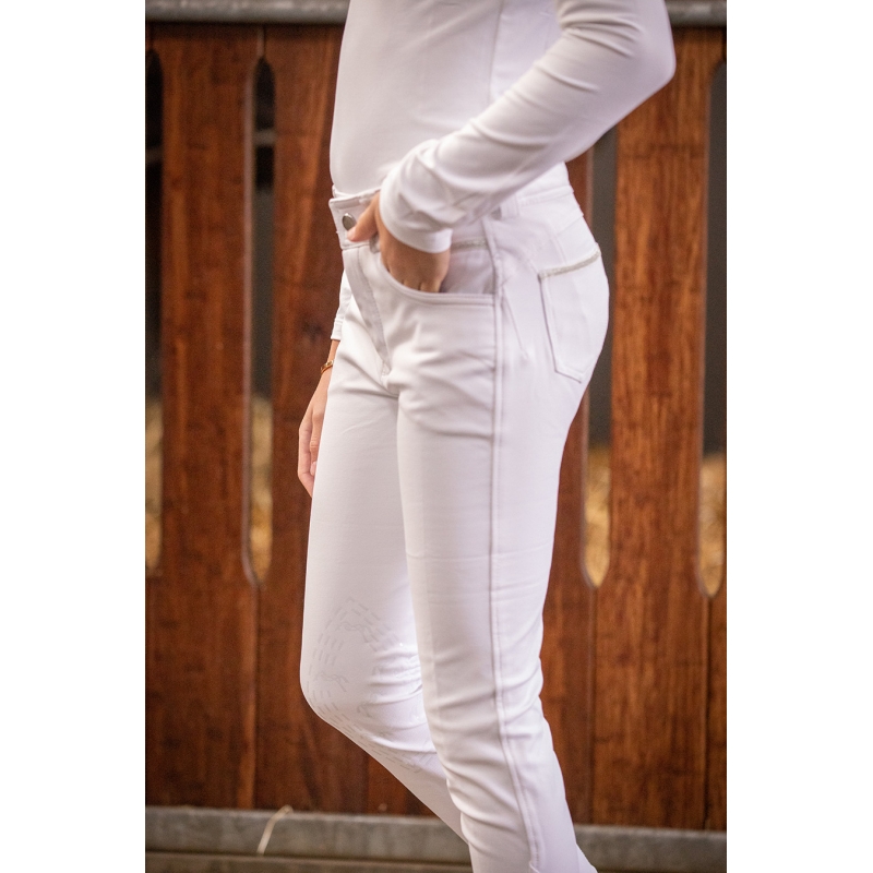 These breeches, specifically designed for children who ride in competition, have two pockets in the front and two in the back which are embellished with a flat silver braid. This braid is also found on the belt loops around the waist. A small Pénélope charm is delicately attached to one of the pockets. It is made of a stretch fabric that is particularly comfortable to wear. The lower legs are made of lycra to adapt to a wide range of body types. Two silver clasps stamped with the Pénélope logo and a zip allow to close our Eden By Penelope Fun breeches.