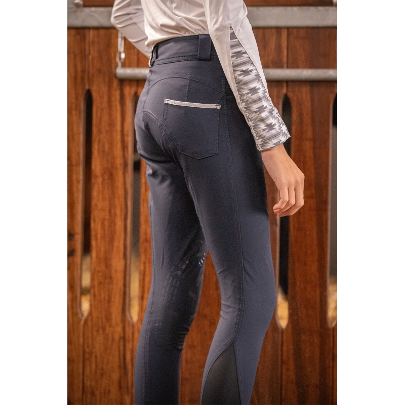 These breeches, specifically designed for children who ride, have two pockets in the front and two in the back which are embellished with a flat silver braid. This braid is also found on the belt loops around the waist. A small Pénélope charm is delicately attached to one of the pockets. It is made of a stretch fabric that is particularly comfortable to wear. The lower legs are made of lycra to adapt to a wide range of body types. Two silver clasps stamped with the Pénélope logo and a zip allow to close our Eden By Penelope Fun breeches.