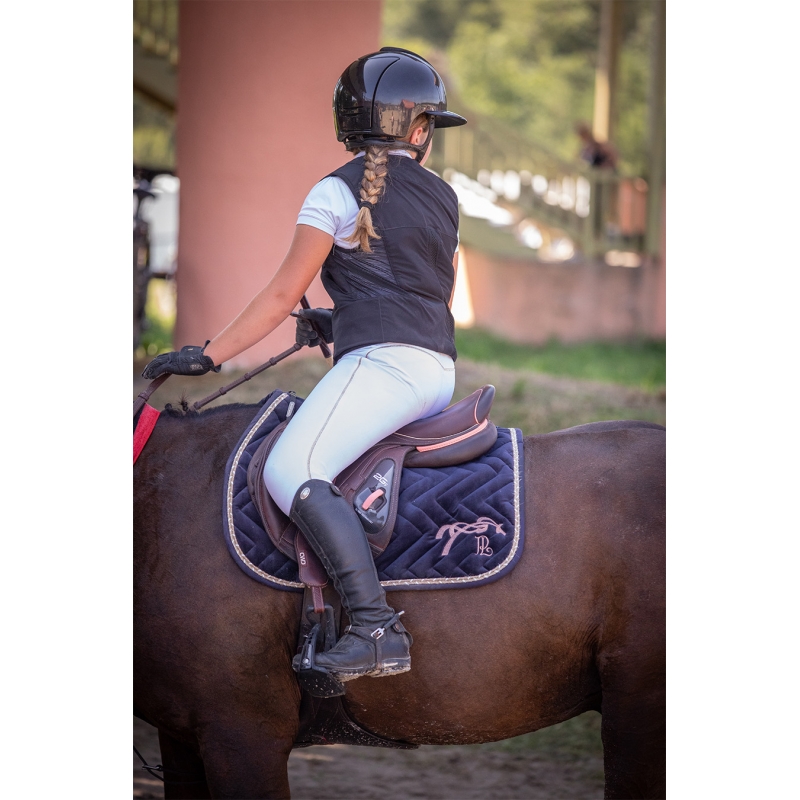 This model, available in the classic cut, also comes in a mini version, suitable for Shetland ponies as well as ponies size B and small C. The soft velvet in which it is made is elegant and quilted in a zigzag pattern. Its well-defined backline allows for proper wither clearance, and its two girth loops ensure maximum stability. Its black honeycomb lining makes it highly breathable and ensures comfort for the horse.