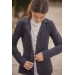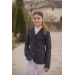 Calista Pénélope show jacket with a sober look, ideal for riding shows. It fits close to the body and is made from a very comfortable stretch fabric. It fastens with a zip hidden by three tone-on-tone buttons, and has two false pockets, one of which is embellished with a small silver Pénélope charm. At the bottom of the sleeves, there's a smaller, but still tonal, buttonhole. At the top of the left arm, a small Pénélope rhinestone perfectly finishes off this elegant yet highly technical show jacket.