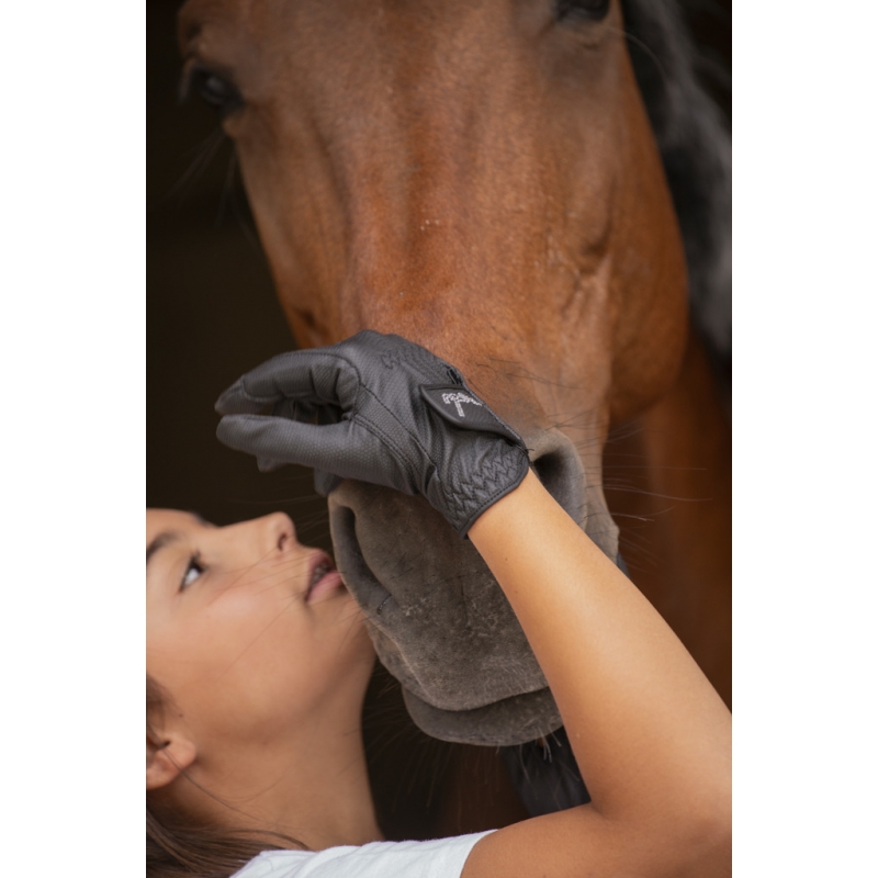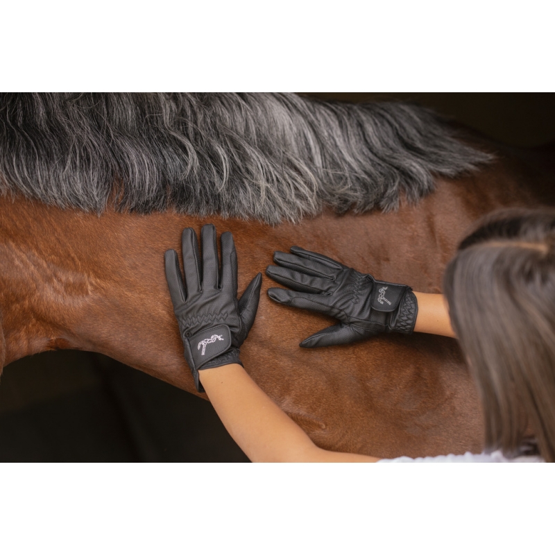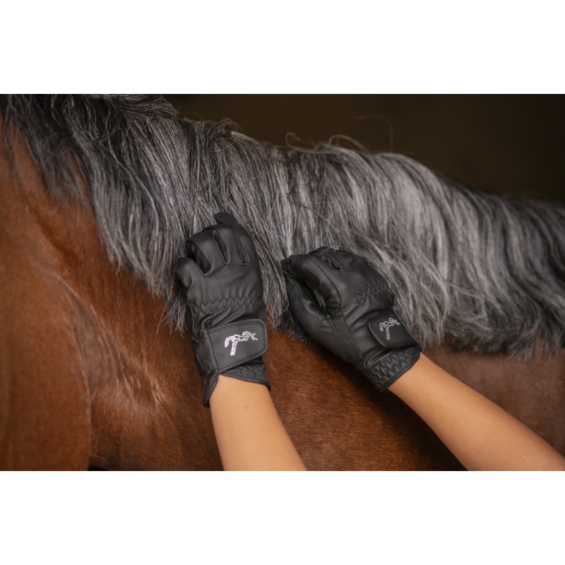 Girly, the "Prisma" gloves by Pénélope are incredibly comfortable for everyday wear. They are slim and well-fitted, allowing riders to maintain full dexterity while on horseback. The area between the thumb and index finger is reinforced for enhanced durability over time. They close with a Velcro strap on the back of the hand, accommodating various wrist sizes. The discreet yet stylish touch is the Pénélope logo in rhinestones on the Velcro, perfectly capturing the essence of the Pénélope brand. These gloves are suitable for both daily sessions at the stables and equestrian shows.