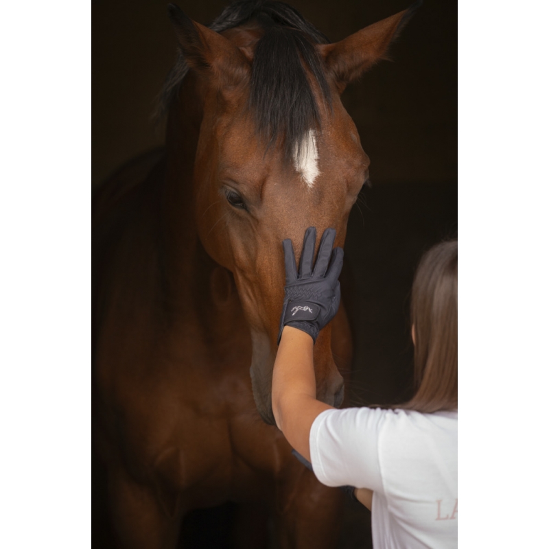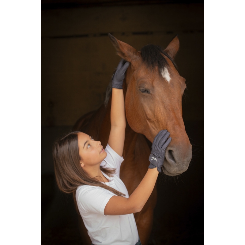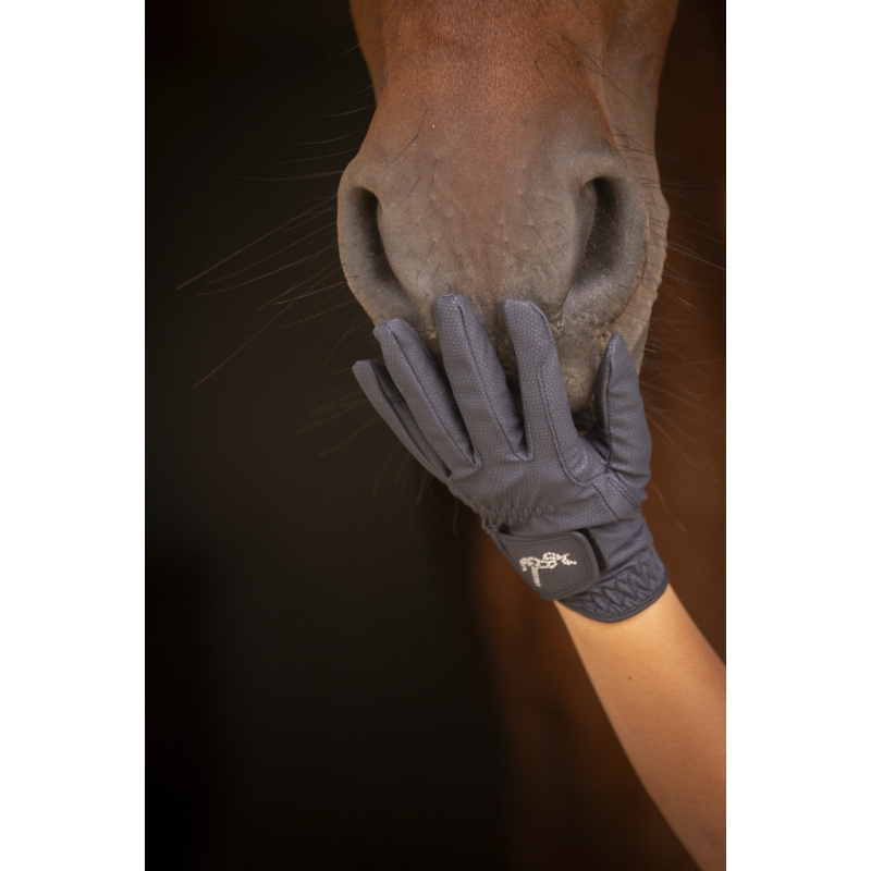 Girly, the "Prisma" gloves by Pénélope are incredibly comfortable for everyday wear. They are slim and well-fitted, allowing riders to maintain full dexterity while on horseback. The area between the thumb and index finger is reinforced for enhanced durability over time. They close with a Velcro strap on the back of the hand, accommodating various wrist sizes. The discreet yet stylish touch is the Pénélope logo in rhinestones on the Velcro, perfectly capturing the essence of the Pénélope brand. These gloves are suitable for both daily sessions at the stables and equestrian shows.