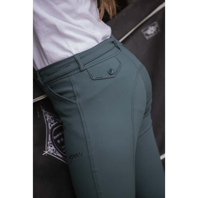 The White Élégance Breeches feature a row of rhinestones on the waistband and along the front and back pockets. A little Penelope horse, also in rhinestones, sits in the middle of the left thigh. These comfortable stretch breeches have non-slip reinforcements on the inside of the knees and a slightly high, close-fitting waist. The lower leg is made from Lycra to adapt to a wide range of body shapes. A very pretty piece that is comfortable to wear and sure to cause a sensation at the stables.