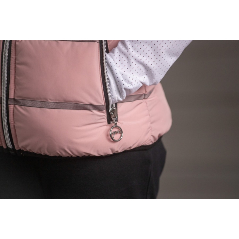 The Anouck sleeveless jacket from the Eden by Pénélope Collection features a lovely thick quilted design in pink. It is finished with a contrasting dark trim along the top of the collar, at the bottom hem, and around the armholes. Perfect for complete freedom of movement both on horseback and on foot, it also provides excellent warmth during the cold season — whether worn over a sweater or layered under a jacket. Two zipped front pockets and a high collar ensure comfort and protection against the cold. The Pénélope logo is embroidered in 3D over the heart.