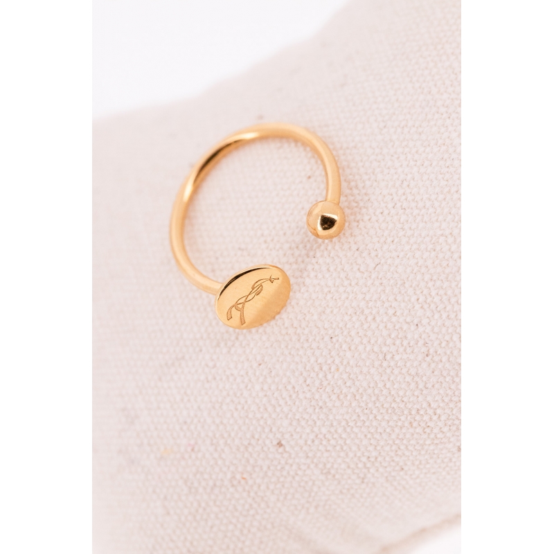 Thin open gold Lisa ring. It is decorated with a pretty little ball and a small plate with the Pénélope logo inlaid. Adjustable thanks to its opening, it can be adapted to many finger sizes.