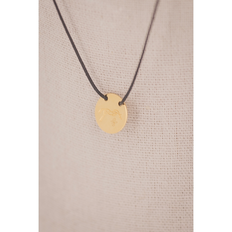 A necklace made up of a thin black cord and a small round plaque featuring the Pénélope logo.