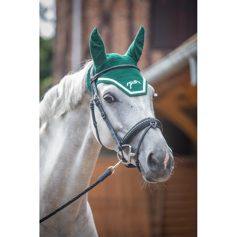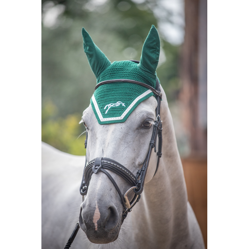 A fly veil with souple and elastic ears, the most comfortable for your horse. He is not disturbed with flies or noises at the show. Made of crocheted cotton, it comes with a white piping on the head and Pénélope logo embroidery is in matching color. The part behind the ears is really wide. It can be used with an anatomical headpiece and it comes with a square shape in the front. This fly veil is made to perfectly match the Point Sellier saddle pad HERE