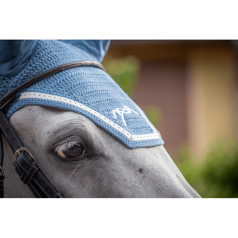 A fly veil with souple and elastic ears, the most comfortable for your horse. He is not disturbed with flies or noises at the show. Made of crocheted cotton, it comes with a white piping on the head and Pénélope logo embroidery is in matching color. The part behind the ear is really wide and it can be used with an anatomical headpiece. It comes with a square shape in the front. This fly veil is made to match perfectly the Point Sellier saddle pad of the same color HERE