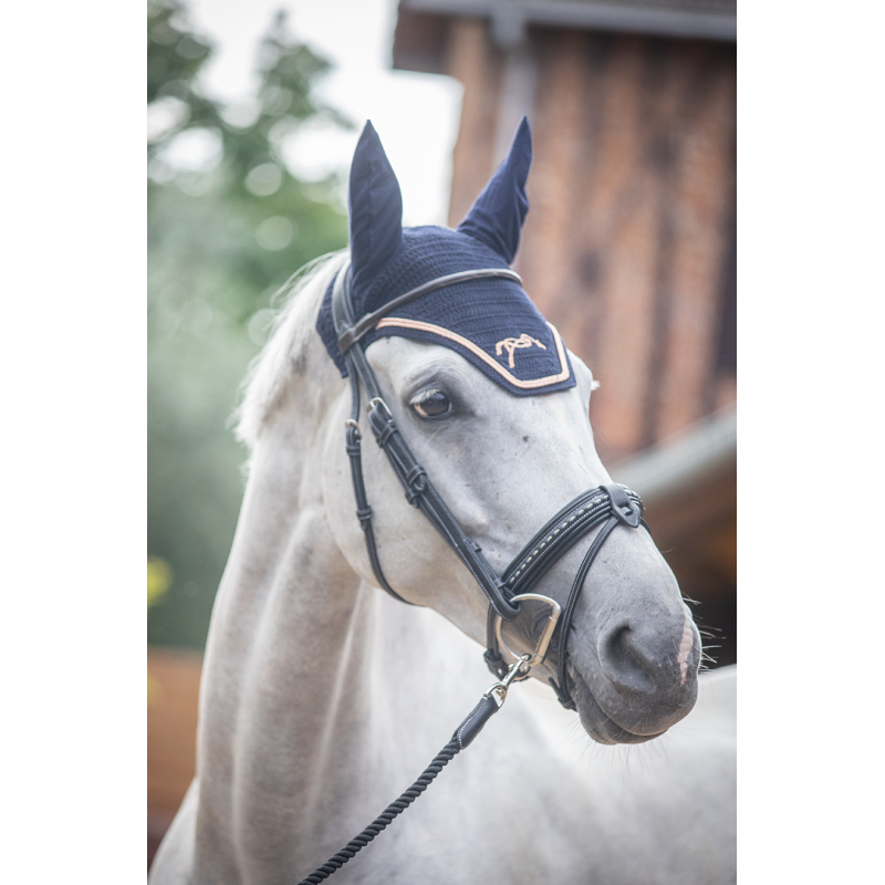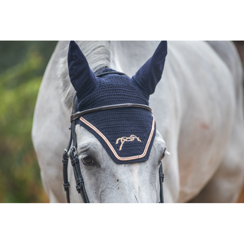 A fly veil with souple and elastic ears, the most comfortable for your horse. He is not disturbed with flies or noises at the show. Made of crocheted cotton, it comes with a golden piping on the head and Pénélope logo embroidery is in matching color. The part behind the ear is really wide and it can be used with an anatomical headpiece. It comes with a square shape in the front. This fly veil is made to match perfectly the Point Sellier saddle pad of the same color HERE