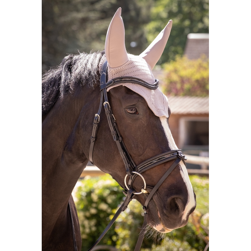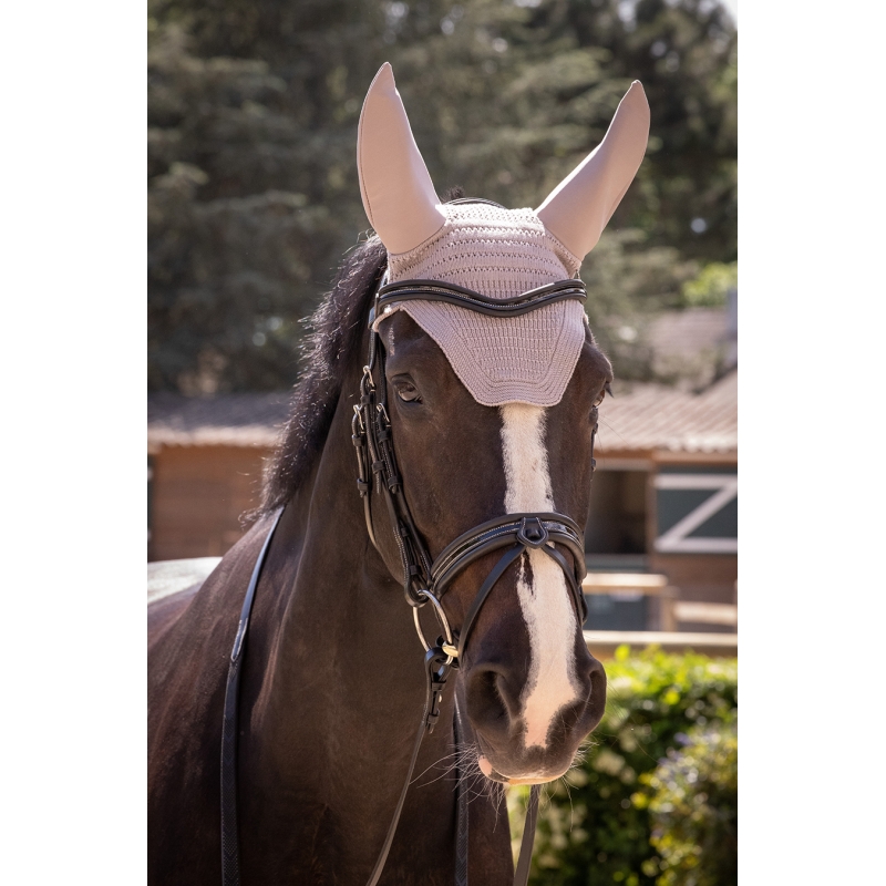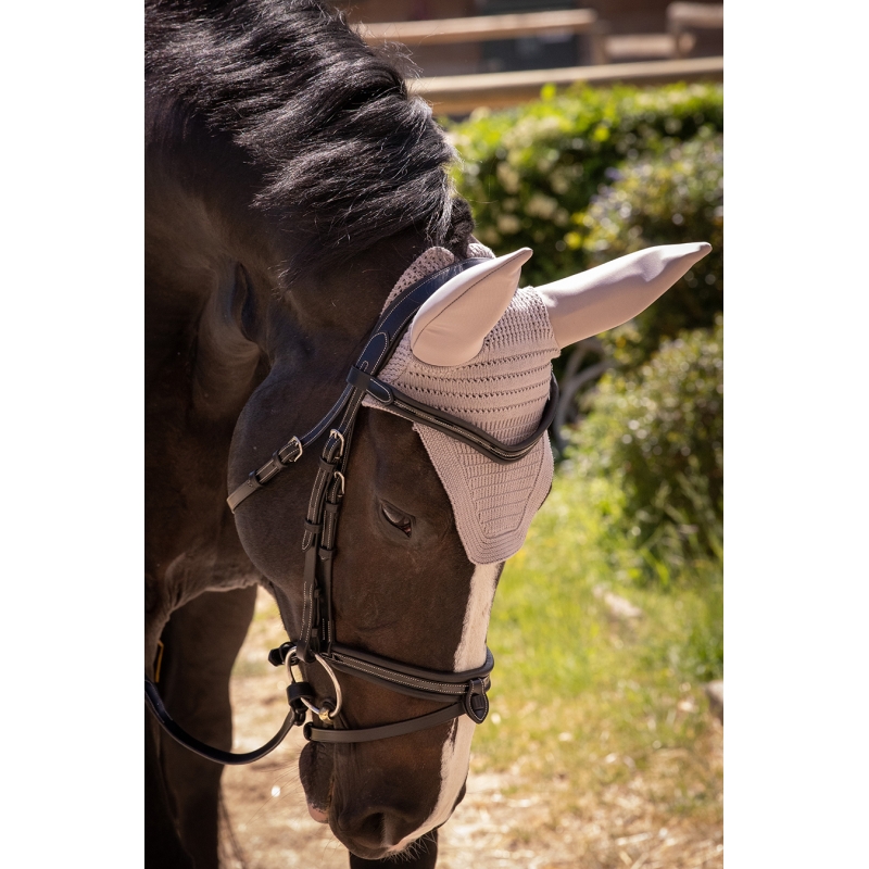 A particularly useful item for tense or stressed horses at shows or at home in the stables. The ears of the Soundless Fly Veil are made of a thick, well-lined fabric to isolate the horse from outside noise and help him stay focused. It is also an ally against insects and other bad weather that can get into the horse's ears and bother him. The part placed on the muzzle is nicely crocheted, the headpiece area is wide and the whole is well encompassing on the head.
