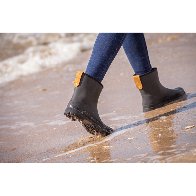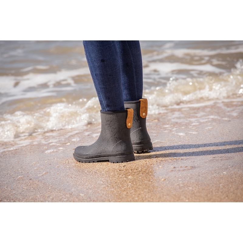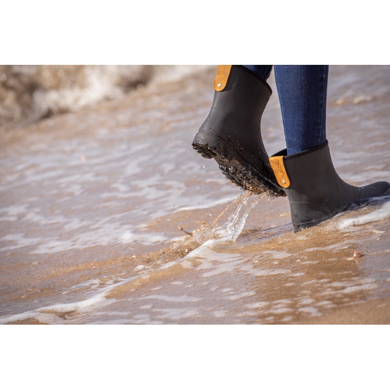 Pénélope "Lulu" waterproof rain boots. This model is the low version of the "Lola" boots. They are just perfect to walk everywhere, by any weather ! Easy to put on, Lulu has a perfect feet to hold yours in it, so you can't loose them ! Made of rubber, 100%, they are very resistant, and easy to wash, water with a hose and it is done. For the look, they are available in black and have a small leatherette tab straddling the top at the back of the boot, with the Pénélope logo embossed.