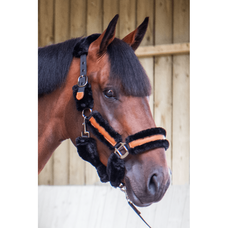 A halter designed for comfort and aestheticism for your horse. The leather parts on the noseband and on both cheek pieces are surrounded by synthetic sheepskin. Everything else is made of nylon, also covered with this gorgeous synthetic sheepskin. The halter is quite flexible, perfect to have your horse travelling, or just for grooming !