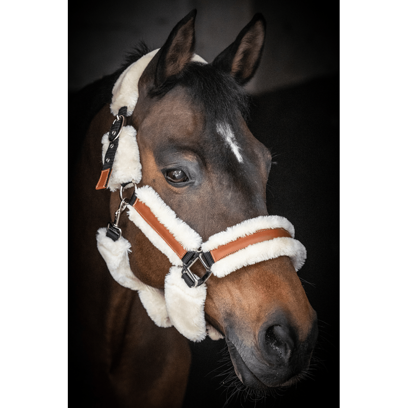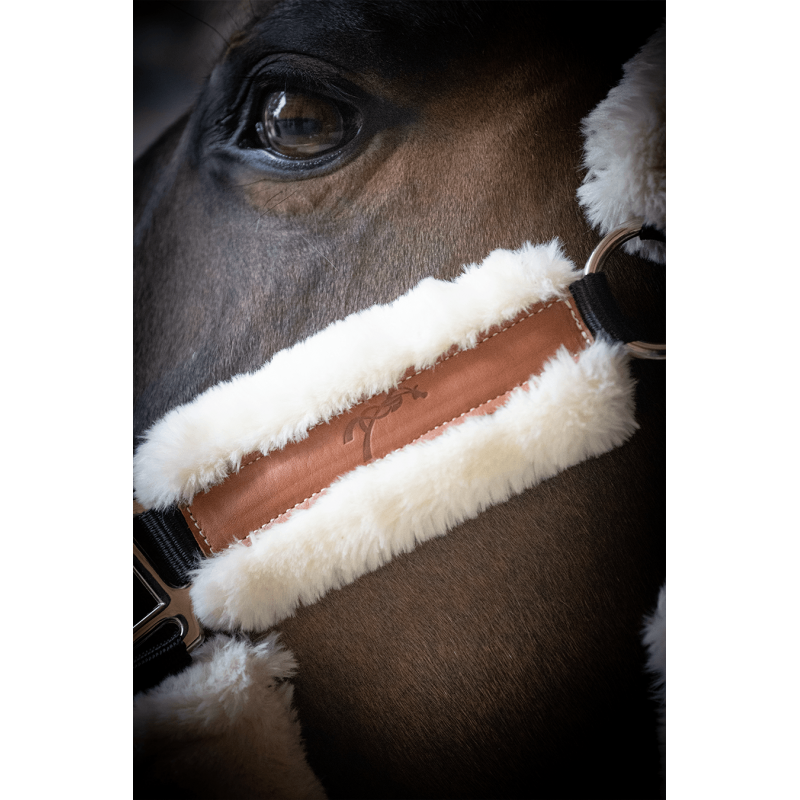 halter designed for comfort and aestheticism for your horse. The leather parts on the noseband and on both cheek pieces are surrounded by synthetic sheepskin. Everything else is made of nylon, also covered with this gorgeous synthetic sheepskin. The halter is quite flexible, perfect to have your horse travelling, or just for grooming !