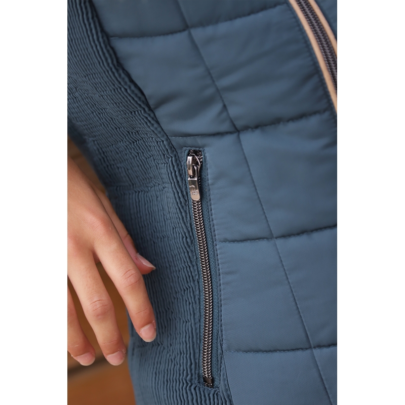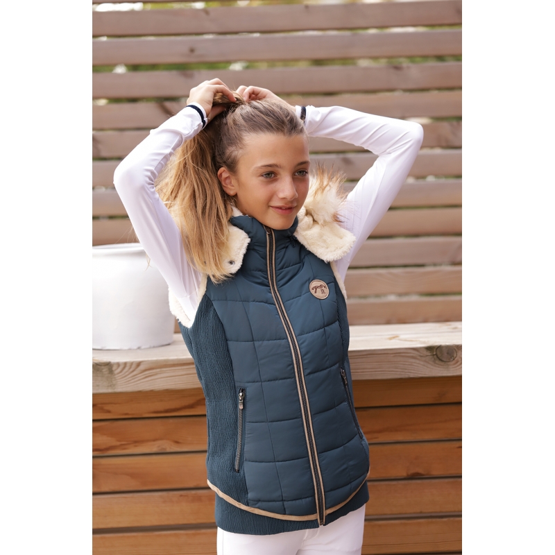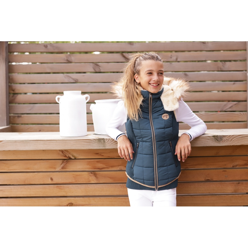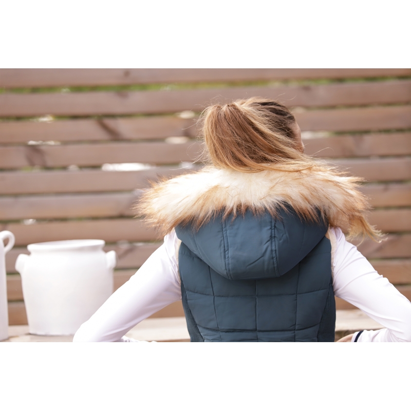 A well known product from Pénélope-store, coming now in Peacock blue colour for 2022 winter. Our sleeveless vest Roger is lined with an ultra-soft and warm fleece. It closes with a central zipper and has a hood with a beautiful fake fur. Stretch bands are sewn on the sides and bottom of the vest to provide a great comfort. On the heart, there is a patch in fake leather with the brand's logo. On the shoulders, there are inserts with the same fake leather fabric. Along the zipper and at the bottom, a braid in a similar fabric gives a nice finish. And, there are two zippered pockets in the front.