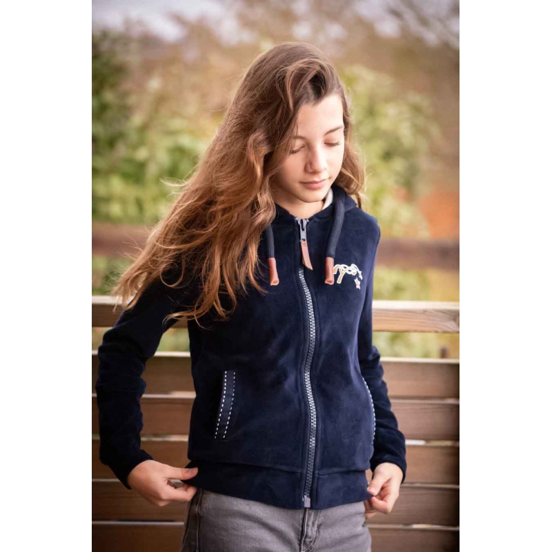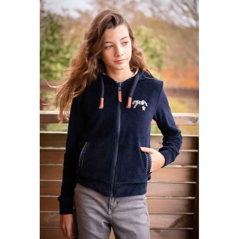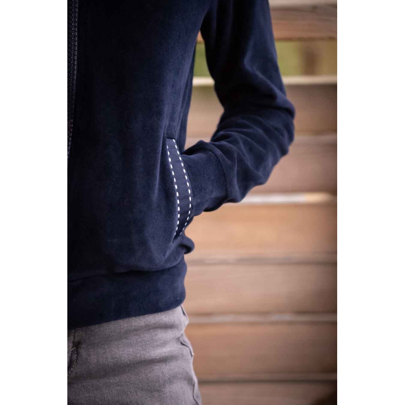 Emy navy velvet hoodie with a front zipper. You already know it from last Spring, Emy hoodie is back for the winter in a different fabric, a super soft velvet. It still comes with a matching tone front zipper, and two pockets overcome with our emblematic Point Sellier stitches. On the left chest is Pénélope logo embroidered in contrasting colors. It has a non removable hood, lined with a white fabric. And of course you can wear Emy over a pair of breeches, but also a pair of jeans!