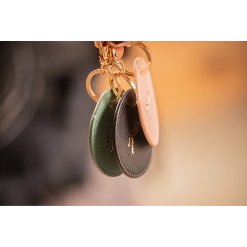 Adorable round keychain featuring the Pénélope logo in gold at the center, with a matching gold key attachment system.
