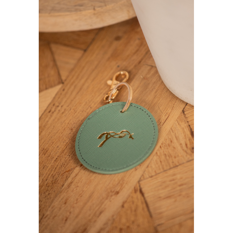 Adorable round keychain featuring the Pénélope logo in gold at the center, with a matching gold key attachment system.