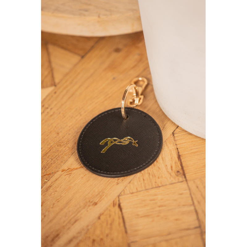 Adorable round keychain featuring the Pénélope logo in gold at the center, with a matching gold key attachment system.