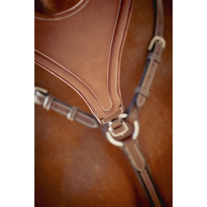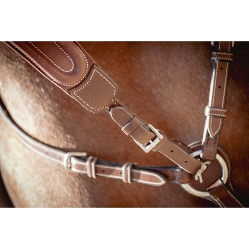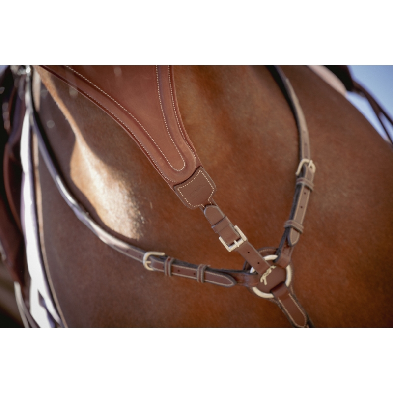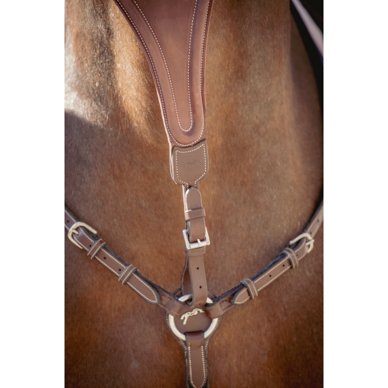 The Bip plain elastic martingale attachment from Pénélope Collections is ideal for guiding certain horses. It helps keep them on a straight rein or limits overly high head carriage. Easily adaptable to any type of breastplate and particularly to our Martin-collier, it consists of a solid leather section embossed with the Pénélope logo. At the ring level, an elastic link runs from each side of the solid section, ensuring comfort in contact with the horse. It attaches to a breastplate or to the Martin-collier with an adjustable buckle.