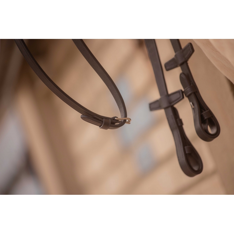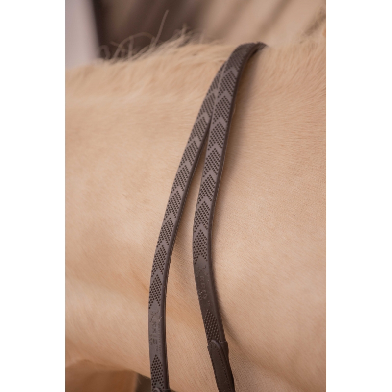 Perfectly matched with the Symphonie bridle, the Symphonie Reins With Stops are crafted from leather with soft rubber and V-shaped grips. Durable and perfectly non-slip, they are available in Full and Cob sizes. Style-wise, the silver-colored buckles add an elegant touch, beautifully complementing the bridle.
